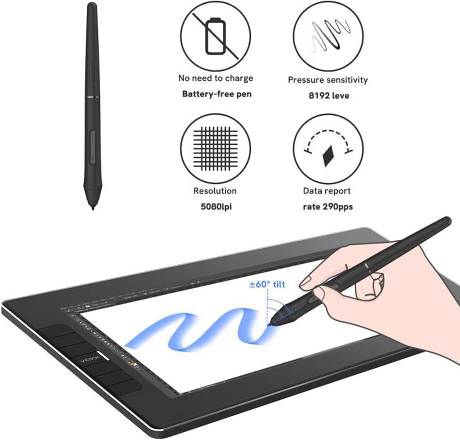 Lápiz sin batería de 8192 niveles: el monitor de dibujo VK1200V2 está equipado con el lápiz óptico sin batería P05, muy cómodo de usar, soporta inclinación de 60°, sin demora y sin necesidad de carga