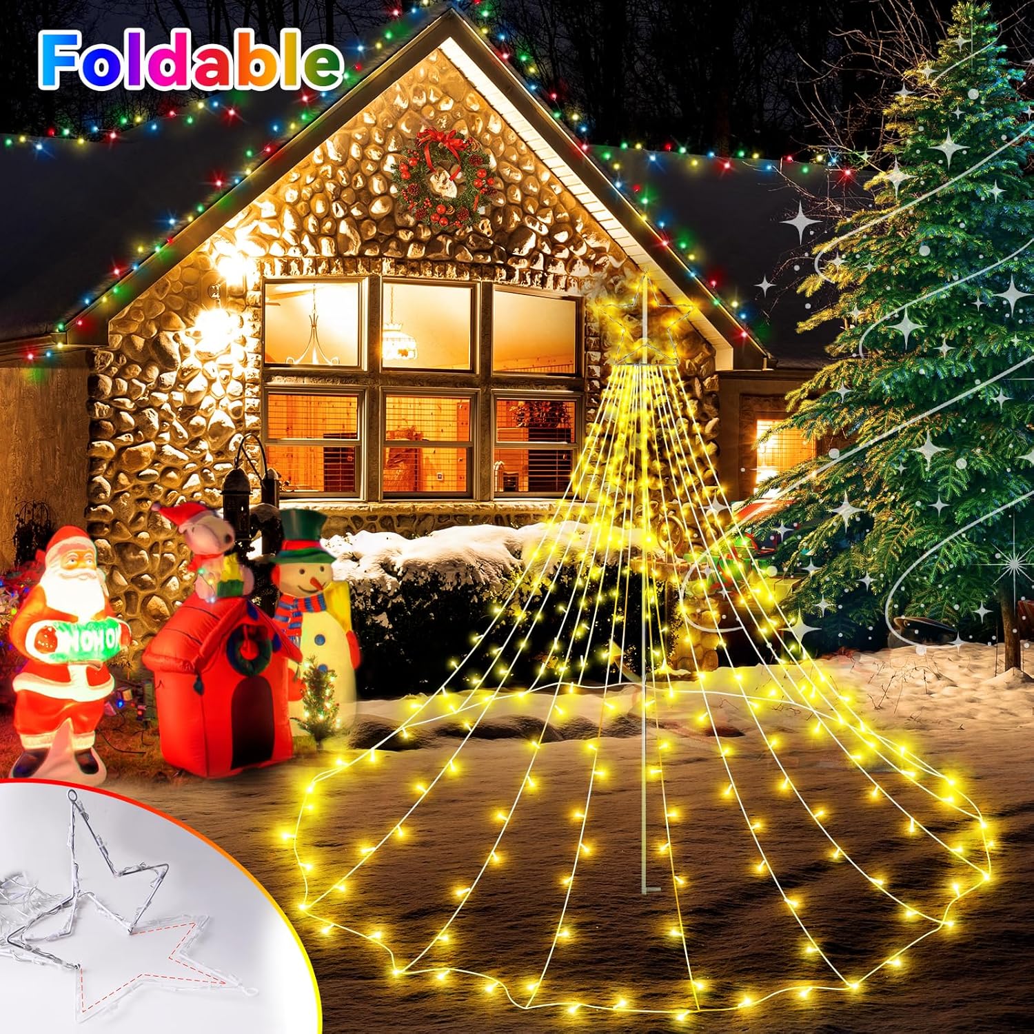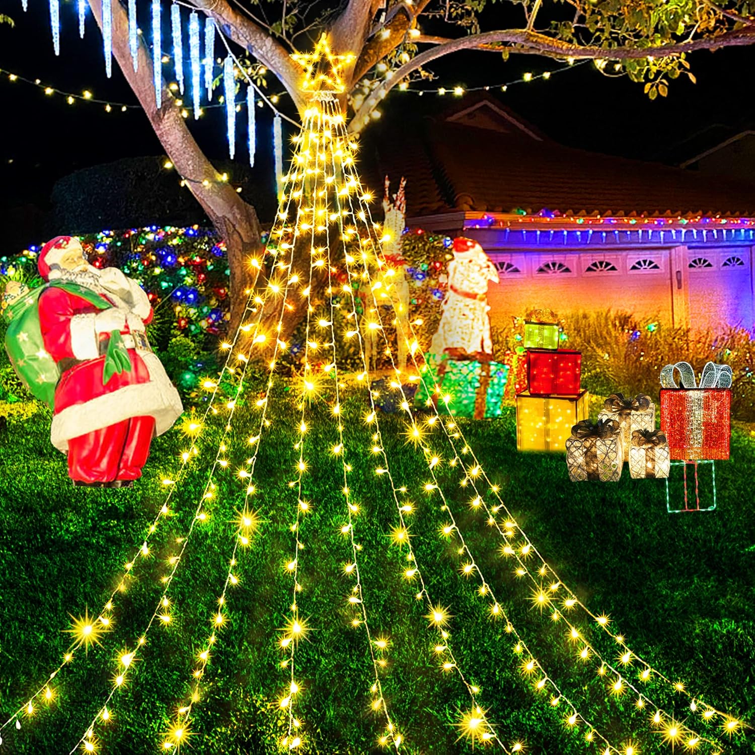 Fácil de instalar y más seguro: las luces navideñas en forma de estrella funcionan muy bien con árboles de entre 8 y 13 pies de altura. Podemos colgarlas en una rama de abedul o en una pared exterior a unos 10 pies de altura. Luego desenrollamos cada mechón de luz y lo clavamos en el suelo. ¡Fue así de fácil! El enchufe certificado por la UL y las bombillas LED de baja temperatura garantizan su seguridad al tacto incluso después de un uso prolongado. Te permite ahorrar tiempo y esfuerzo. ¡Más seguro de usar! 【LED de bajo consumo y cable duradero】Nuestras luces LED para Navidad en forma de cascada están fabricadas con cobre y plástico de alta calidad, son resistentes a los cambios climáticos, por lo que durarán años sin quemarse, consumen menos energía y son más baratas de operar, lo que te permite ahorrar a largo plazo. En comparación con las luces navideñas tradicionales, puede ahorrar energía en un 90%. ¡Económico y duradero! 【8 modos de iluminación】Nuestras luces exteriores de decoración navideña están disponibles en 8 modos de iluminación: combinación, en ondas, secuencial, brillo lento, chasing/flash, atenuación lenta, centelle/flash y encendido continuo. Este es el estilo más clásico: la iluminación a lo largo del alero, la terraza, el balcón o la cerca crea un ambiente encantador. 【Resistente al agua y amplia aplicación】Diseño impermeable IP44 para exteriores, que es perfecto para la decoración de exteriores y puede funcionar normalmente incluso en el frío invierno. La función de memoria se recupera del modo de configuración anterior cuando se reinicia. Ideal para decoración de Navidad, Acción de Gracias, bodas, San Valentín y mucho más. Este es el estilo más clásico. Iluminar el alero, el árbol, la pared, la terraza, el balcón o el árbol de Navidad crea un ambiente encantador. 【Servicio amable y 12 meses de reemplazo gratis】Compre con confianza, le apoyamos, ofrecemos 12 meses de reemplazo gratuito y ofrecemos servicio de atención al cliente en línea las 24 horas, ¡no dude en contactarnos si tiene alguna pregunta!