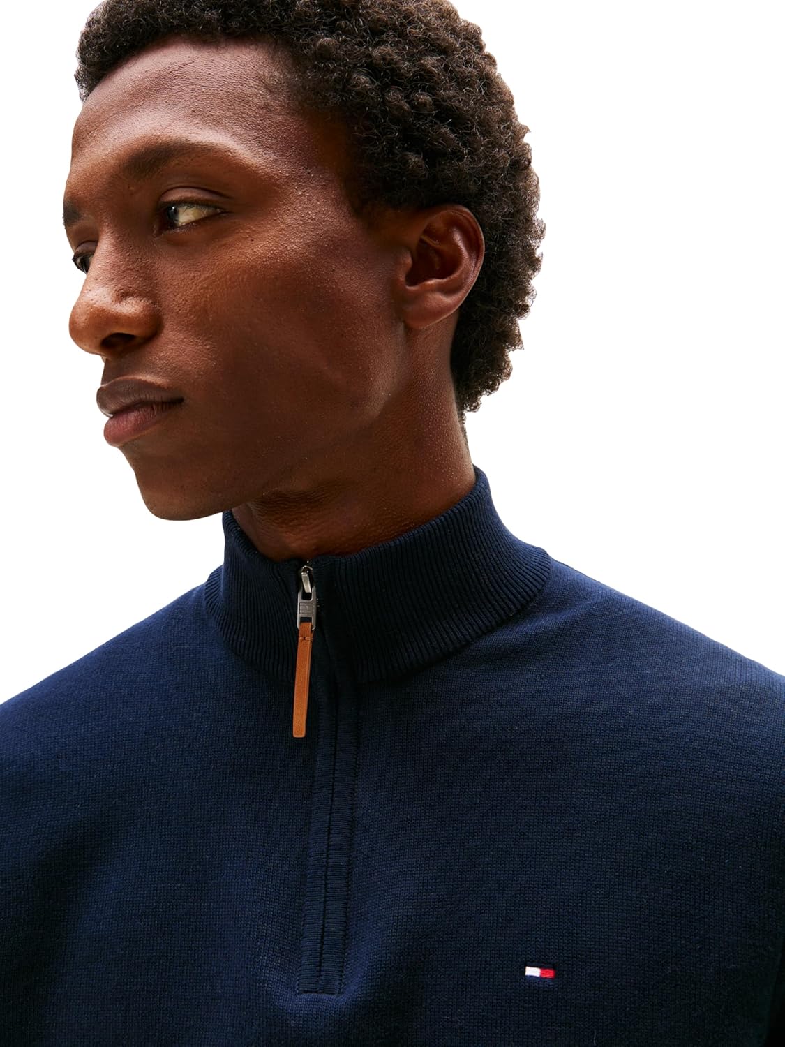 Suéter Tommy Hilfiger para hombre con cremallera de un cuarto y cuello falso. Suéter Tommy con diseño y cuello falso. Suéter para hombre con mangas largas. Suéter para hombre con cierre de cremallera. Suéter Tommy Hilfiger con bandera bordada en el pecho.