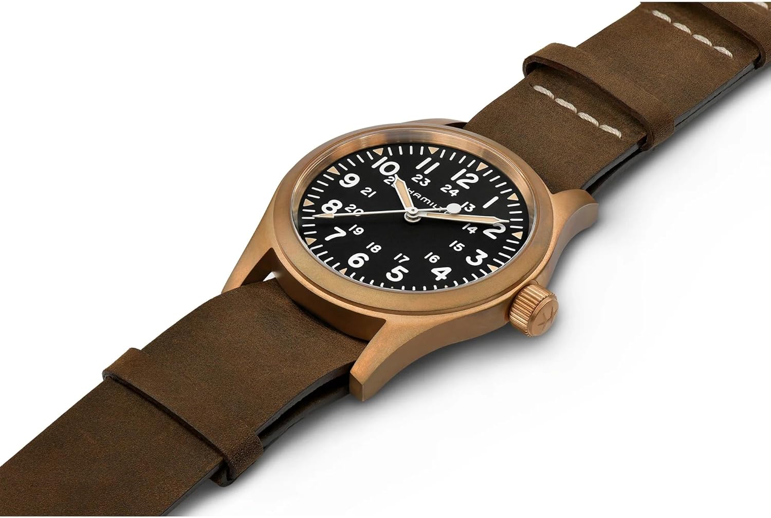 Hamilton Watch Khaki Field Mechanical Bronze | Swiss Made | 38mm Stainless Steel Case | Black Dial Analog Watch | Brown Leather NATO Strap (Model: H69459530)