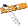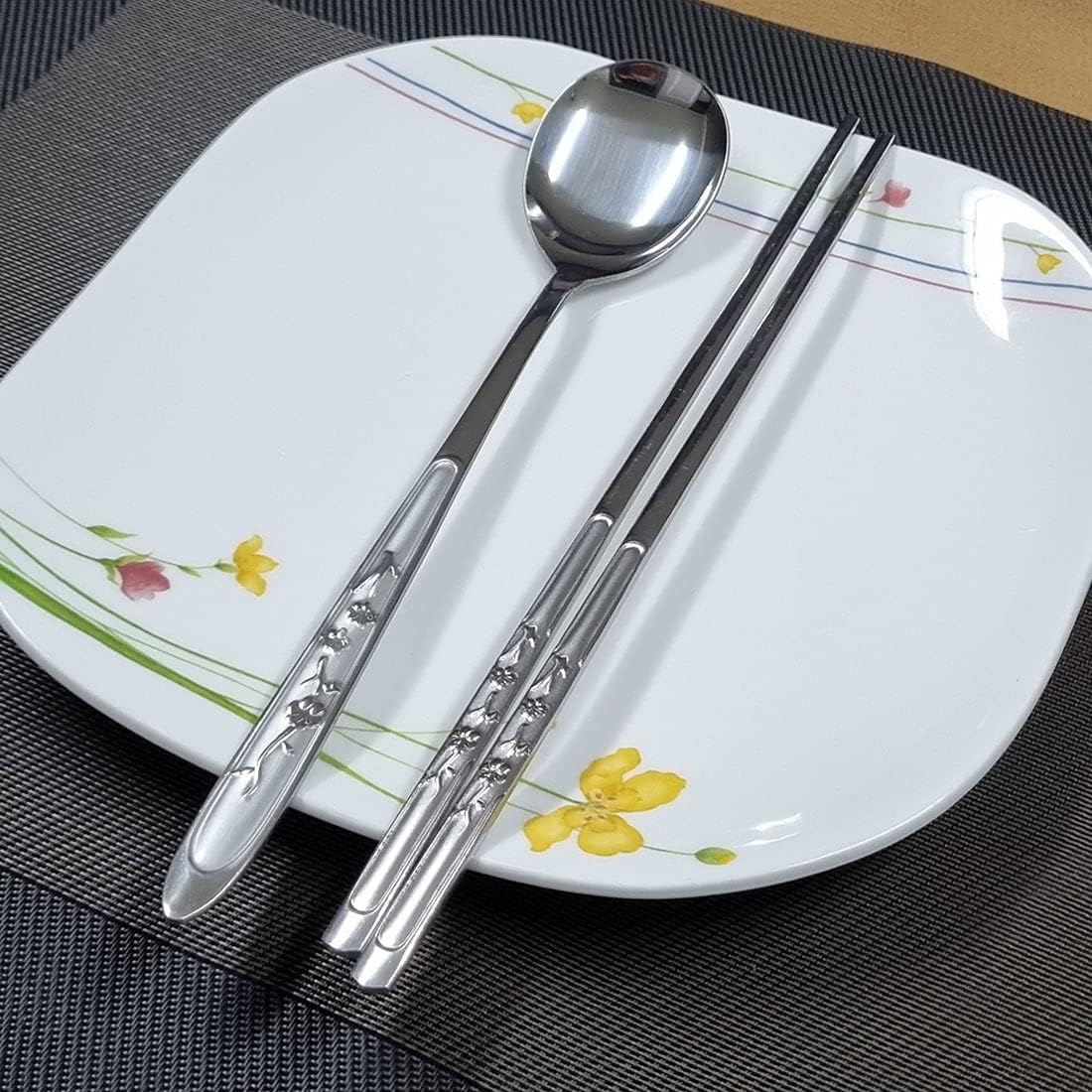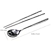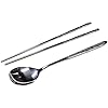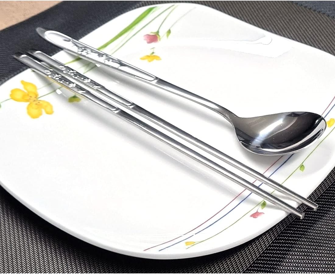 1 set (1 cuchara + 2 palillos planos) en un paquete. Vajilla tradicional coreana de acero inoxidable pulido.