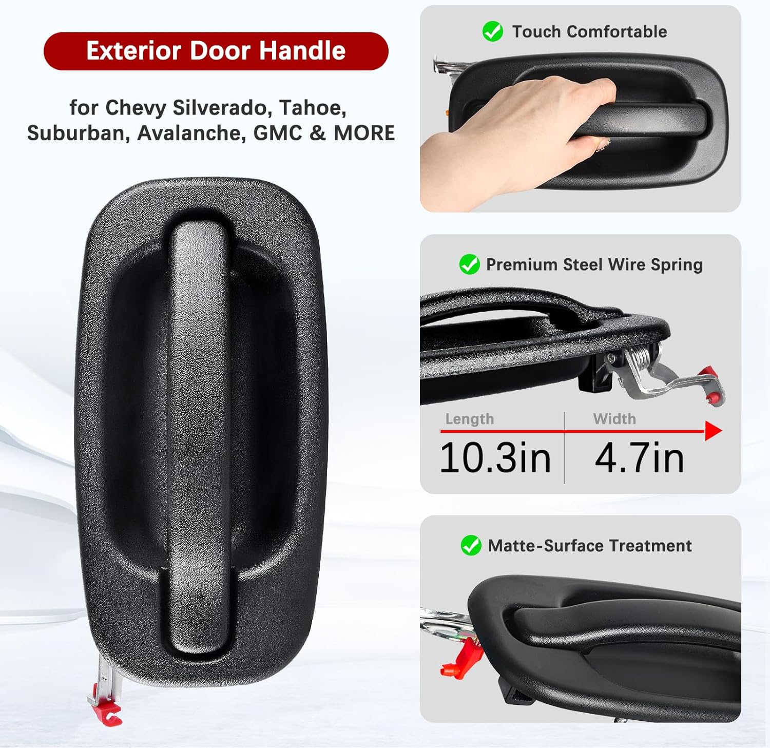 🚗【DIRECT FIT & EASY INSTALLATION】 This outside door handle is made of high quality ABS materials and matte-surface treatment, it's more resistant to cold and heat, ensures structural integrity for longer use. OE-Like design ensures structural integrity and perfect fit, easy to install and save your value time. Compatible with Cadillac Escalade 2002-2006, Escalade ESV 2003-2006; Compatible with chevy Suburban 1500 2000-2006, Suburban 2500 2000-2006, Tahoe 2000-2006.