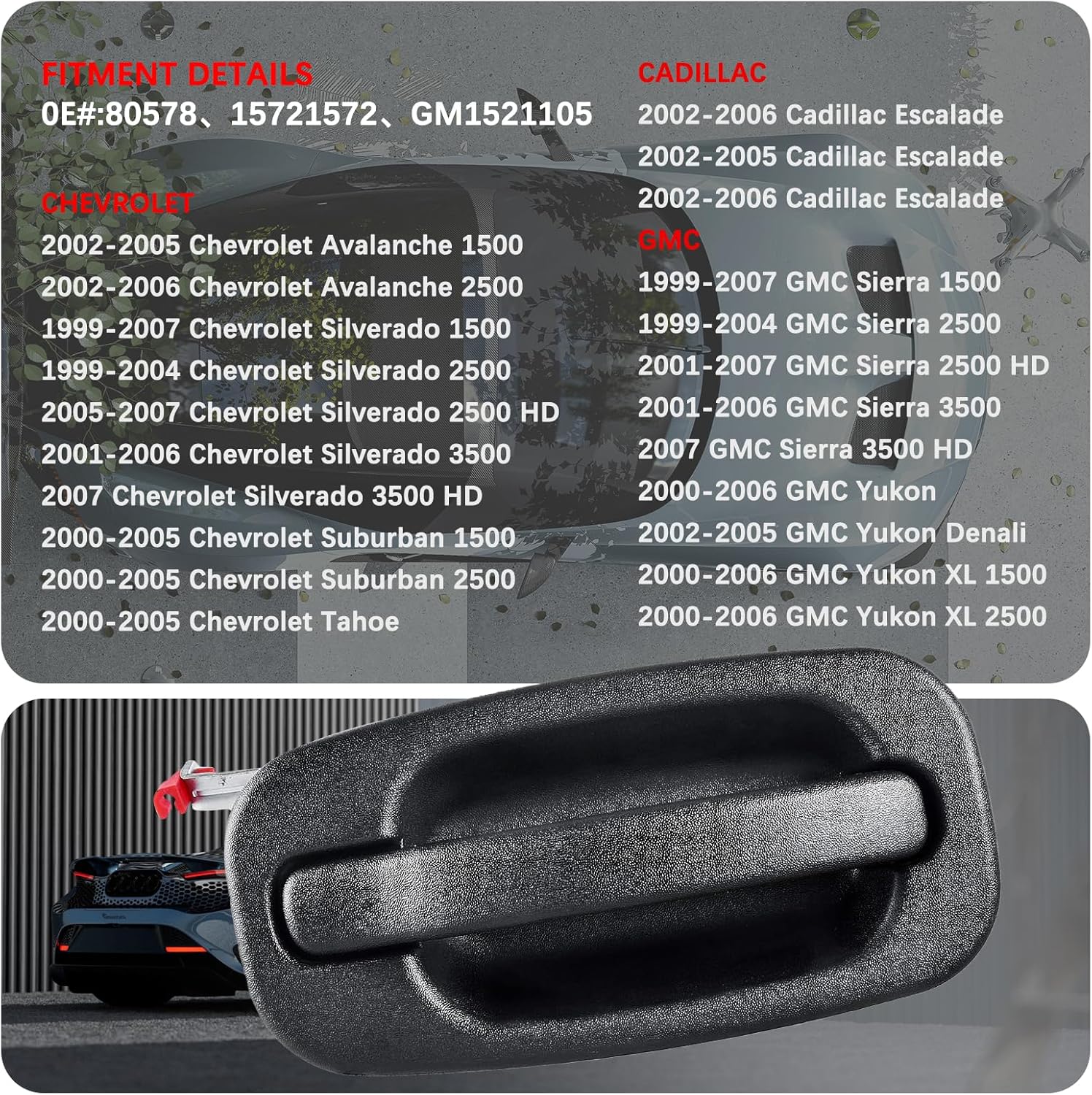 🚗【COMPATIBLE VEHICLES】This exterior rear right passenger door handle compatible with 1999-2007 Chevy Silverado/Sierra, 2002-2006 Avalanche/Escalade, 2000-2006 Yukon, Yukon XL & Tahoe & Suburban, 2002-2005 Denali & MORE. Compatible with chevy Avalanche 1500 2002-2006, Avalanche 2500 2002-2006, Silverado 1500 2004-2006, Silverado 1500 HD 2001-2003 2005-2006, Silverado 2500 2004, Silverado 2500 HD 2001-2006, Silverado 3500 2001-2006; Compatible with GMC Sierra 1500 2004-2006, Sierra 1500 HD.