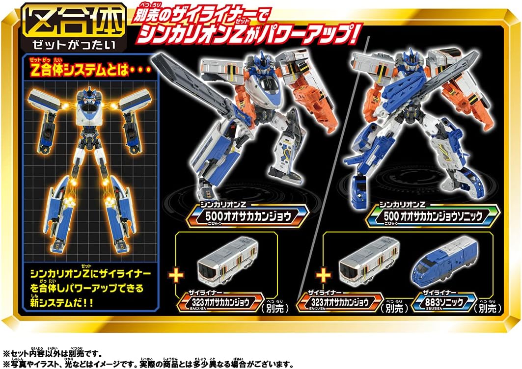 The Shinkalion Z500 Kodama from the TV anime "Shinkansen Henkei Robot Shinkalion Z" has appeared in Plarail. It has a 3-car structure that transforms from a bullet train to a robot. Equipped with a "Z Combine" system that can be combined with Zi-Liner! Power up by combining Z with Zi-Liner products sold separately. Combine Zi-Liner to create your own strongest Z combination! Rails and electric vehicles are not included.