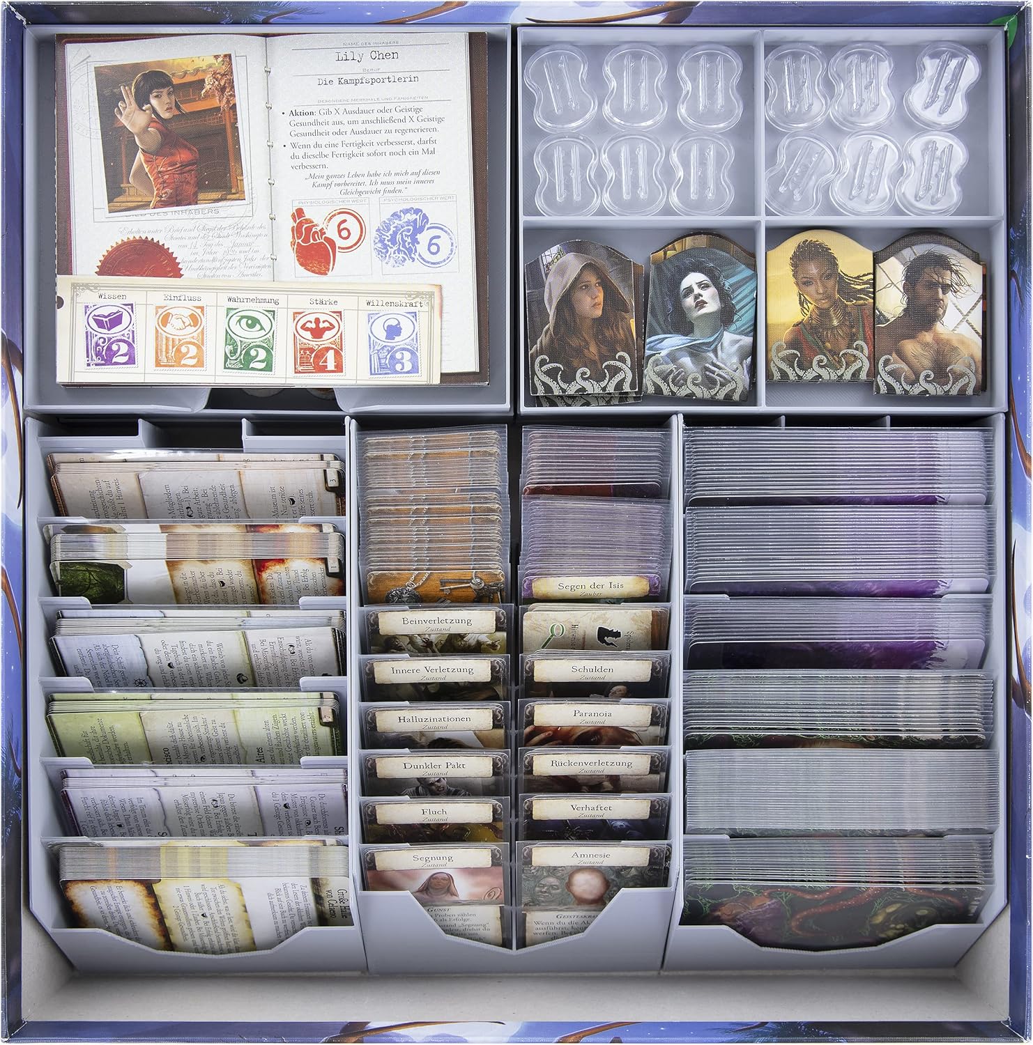 El set consta de: 5 soportes de plástico para marcadores para ordenar fichas y dados y 4 soportes de plástico para cartas Estándar y Mini Americanas. Proporciona espacio para todo el contenido del juego del Eldritch Horror base.