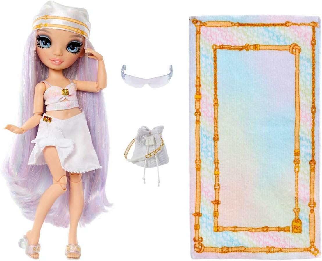 Rainbow High Pacific Coast Margot De Perla - Muñeca de moda opalina (blanco iridescente) con 2 conjuntos de ropa de diseñador, juego de accesorios de piscina, piernas intercambiables, juguetes para niños
