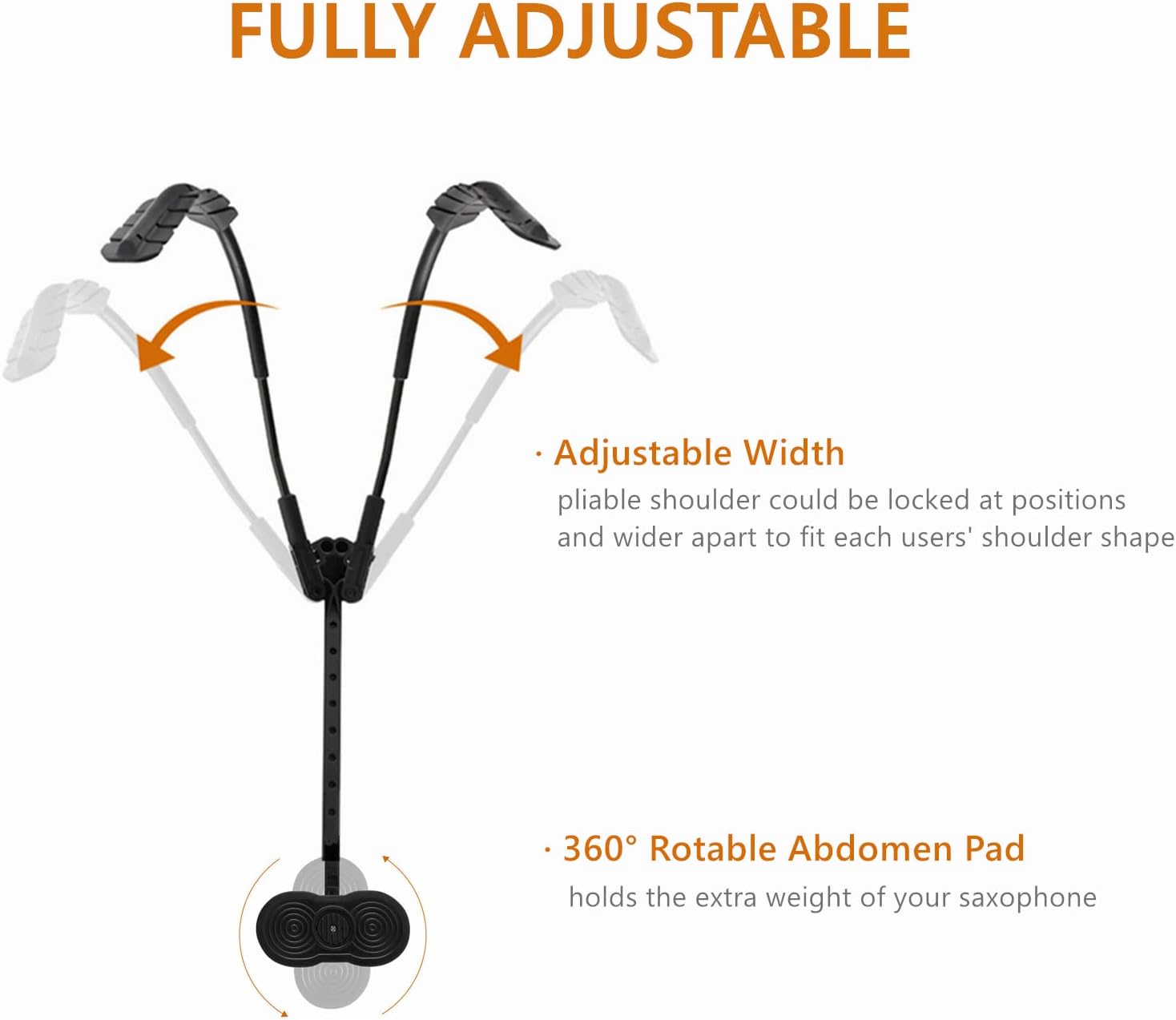 Soporte para saxofón: puedes plegar este arnés de hombro para saxofón para que sea más pequeño que un papel, ahorrando espacio y más conveniente para llevar. Presione el bloqueo trasero para ajustar la longitud, el más corto ajustable alrededor de 38 cm, el más largo ajustable alrededor de 48 cm.