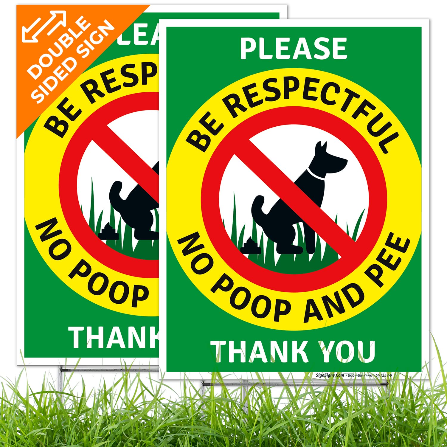 Please Be Respectful No Poop And Pee Thank You Sign, (2 Pack) Double Sided 9x12 Inches, Corrugated Plastic with Metal H Stake, Made in USA