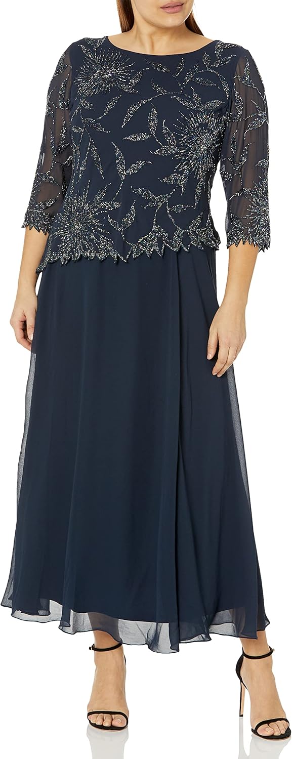 J Kara Women's Scoop Neck Line with 3/4 Sleeve Beaded Top Long Dress