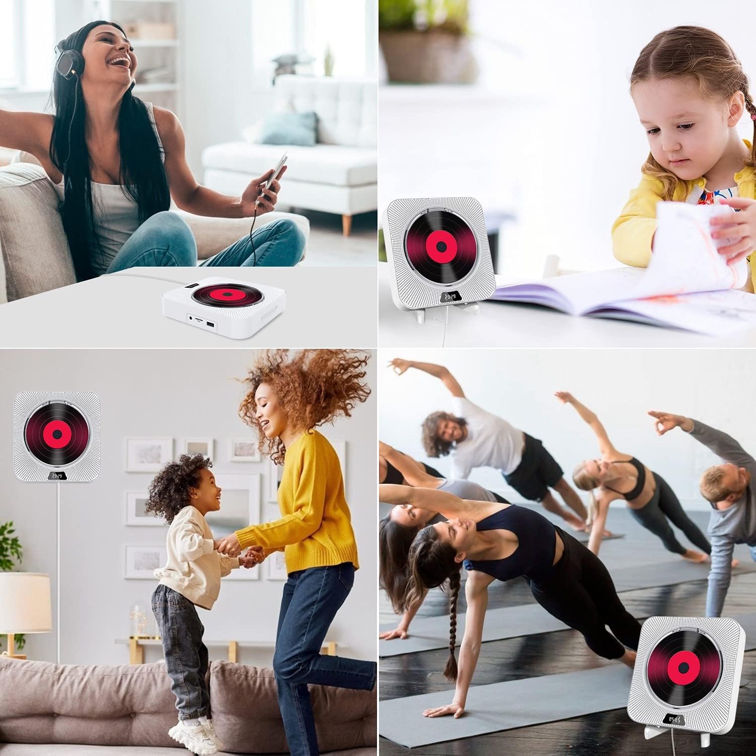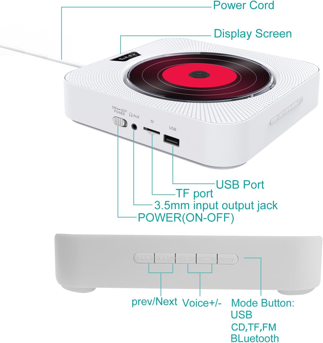 Reproductor de CD Bluetooth portátil, Reproductor de CD para montar en pared para el hogar con control remoto, cubierta protectora contra el polvo, pantalla LCD, altavoces HiFi incorporados, radio FM, soporte de entrada/salida de CD/MP3/USB/TF/AUX (blanco)