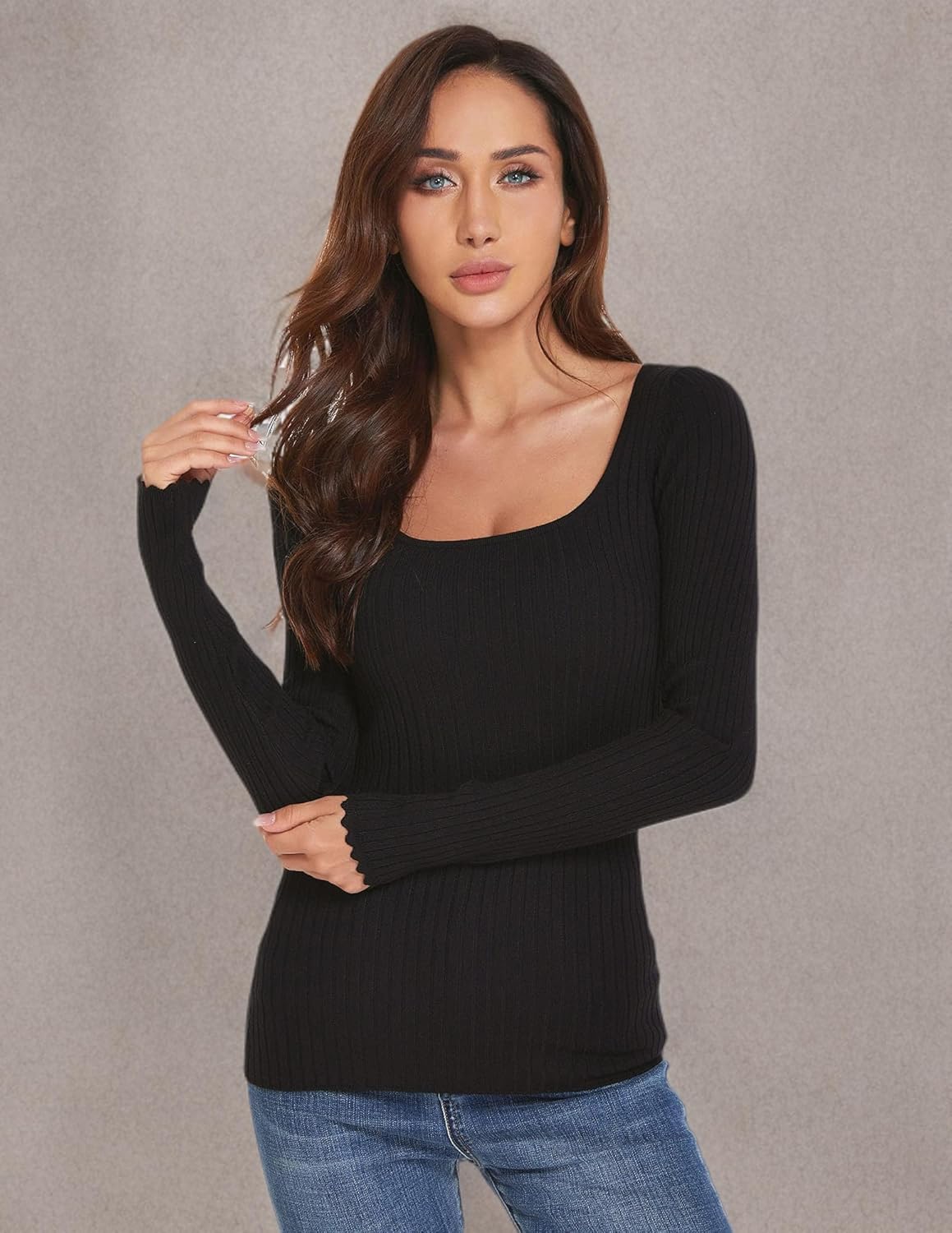 AmélieBoutik Women Scoop Neck Long Sleeve Scalloped Cuff Ribbed Pullover Sweater