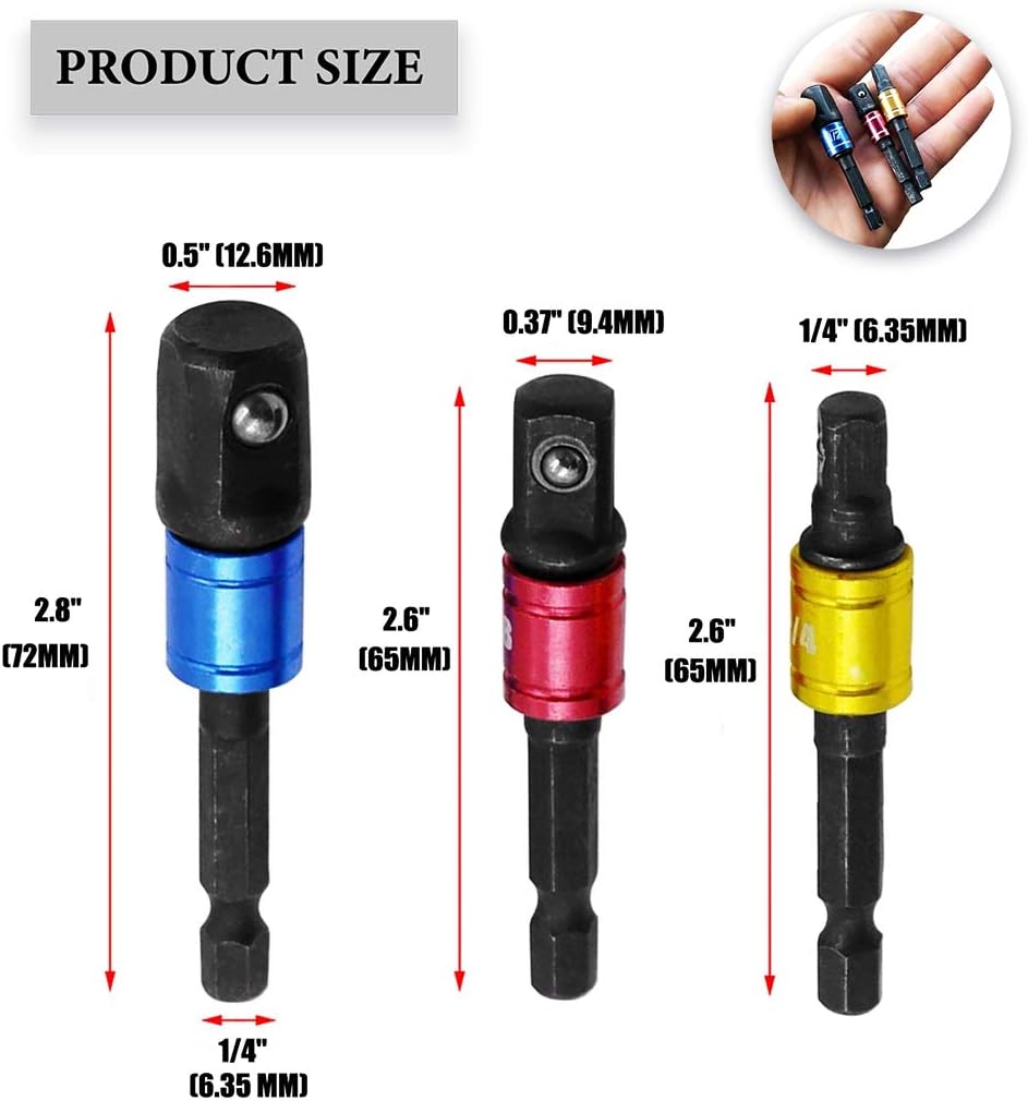 ✮ [DIMENSIÓN-3PCS ADAPTADOR DE ZÓCALO]- Adaptador de 1/4" de conducción, adaptador de 3/8" de conducción y adaptador de 1/2" de conducción, cada uno con un adaptador de llave de zócalo hexagonal de 1/4 pulgada. 1/4" 3/8" 1/2" Convierte cualquier taladro eléctrico en un taladro de tuercas eléctrico. Los bordes chafados y la bola de retención con resorte asegurarán un ajuste ajustado y seguro, permitiendo un trabajo de ahorro de tiempo y esfuerzo en espacios confinados o estrechos;