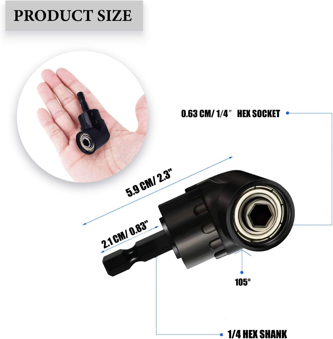 ✮ [DIMENSIÓN-ACCESORIO DE BROCADOR DE ÁNGULO RECTO DE 105°]- La extensión de broca de ángulo recto tiene un vástago hexagonal estándar de 1/4'' y un enchufe hexagonal de 1/4''; El torque máximo del adaptador de broca angular es de 15N; Solo para cabezal de ángulo recto;
