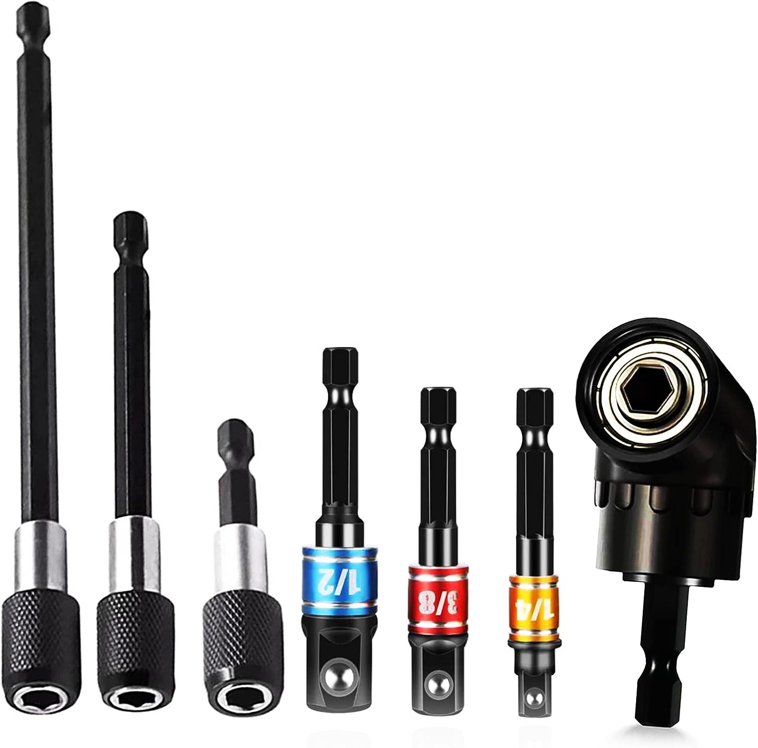 ✮ [PAQUETE VALIOSO]- Incluye: 3 piezas de extensiones de brocas de varios largos, 3 piezas de adaptadores de zócalo de grado de impacto y 1 pieza de accesorio de broca de ángulo recto; gran kit de accesorios para la conversión y extensión de brocas de taladro, proporcionando acceso a espacios estrechos y confinados;