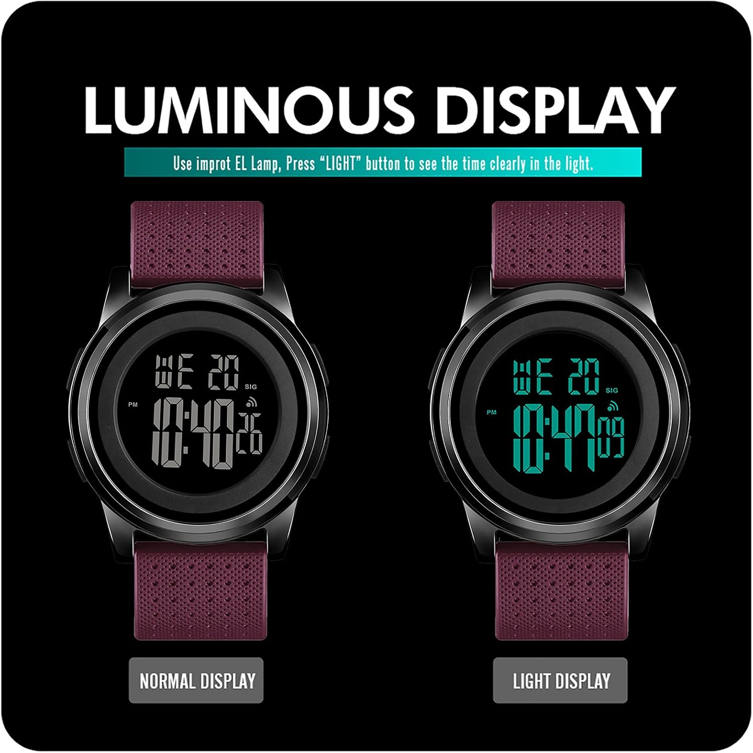 Este reloj digital tiene un estilo fino y elegante, la funda está hecha de acero inoxidable, diseño simple, correa suave y elástica que se ajusta a la muñeca, adecuado para diversas ocasiones y ropa. Diseño moderno adecuado para hombres y mujeres Funciones sencillas y fáciles de usar: impermeable, interruptor de 12/24 horas, despertador, alarma horaria y alarma diaria, fecha automática, cronómetro y luz LED Resistente al agua hasta 50 m (165 pies): no pulses ningún botón bajo el agua, es adecuado para nadar en aguas poco profundas y ducharse con agua fría, pero manténgalo alejado del agua caliente y el vapor, no apto para actividades subacuáticas prolongadas, como el buceo Caja de acero inoxidable con esfera mineral. Mecanismo de cuarzo con pantalla digital, correa de resina con cierre de hebilla. El equipo de soporte de la tienda YUINK tiene un buen servicio postventa. Si tiene alguna pregunta sobre el producto, póngase en contacto conmigo de inmediato y le daremos una solución satisfactoria que le permitirá eliminar los problemas de compra.