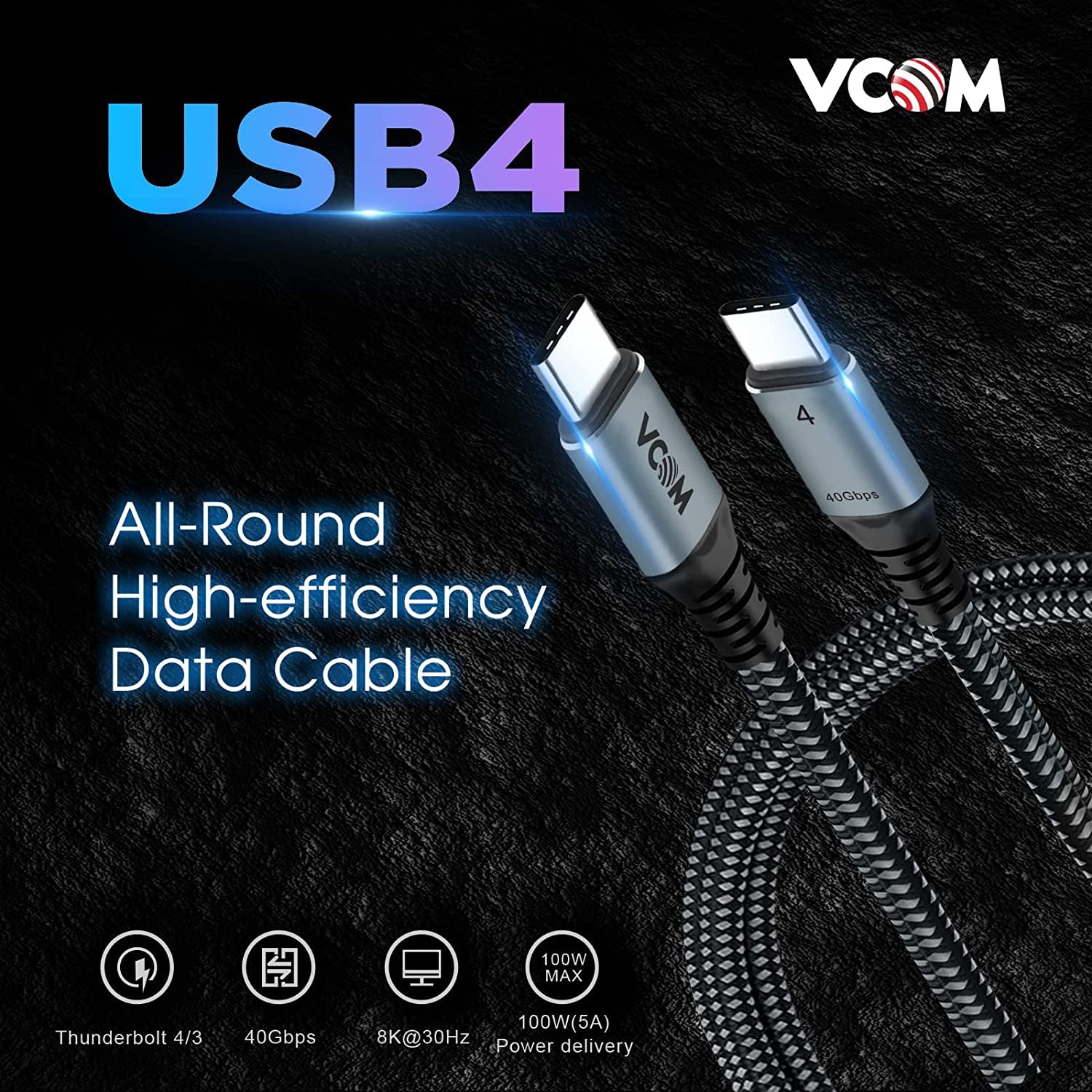VCOM USB 4 Cable for Thunderbolt 4, 4 FT 100W with 40Gbps Data and 8K@30Hz 5K@60Hz or Dual 4K Video,Compatible with Thunderbolt 3/4 Cable and USB-C,for MacBooks,Hub, Docking, and More