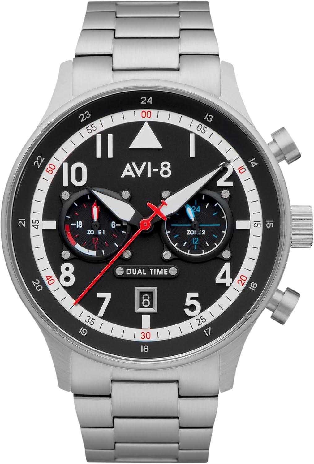 AVI-8 Hawker Hurricane Carey Men's Dual Time Pilot Watch – Japanese Quartz Movement, 43.5mm Stainless Steel Case, Stainless Steel Bracelet, AV-4088-11 - Rangoon