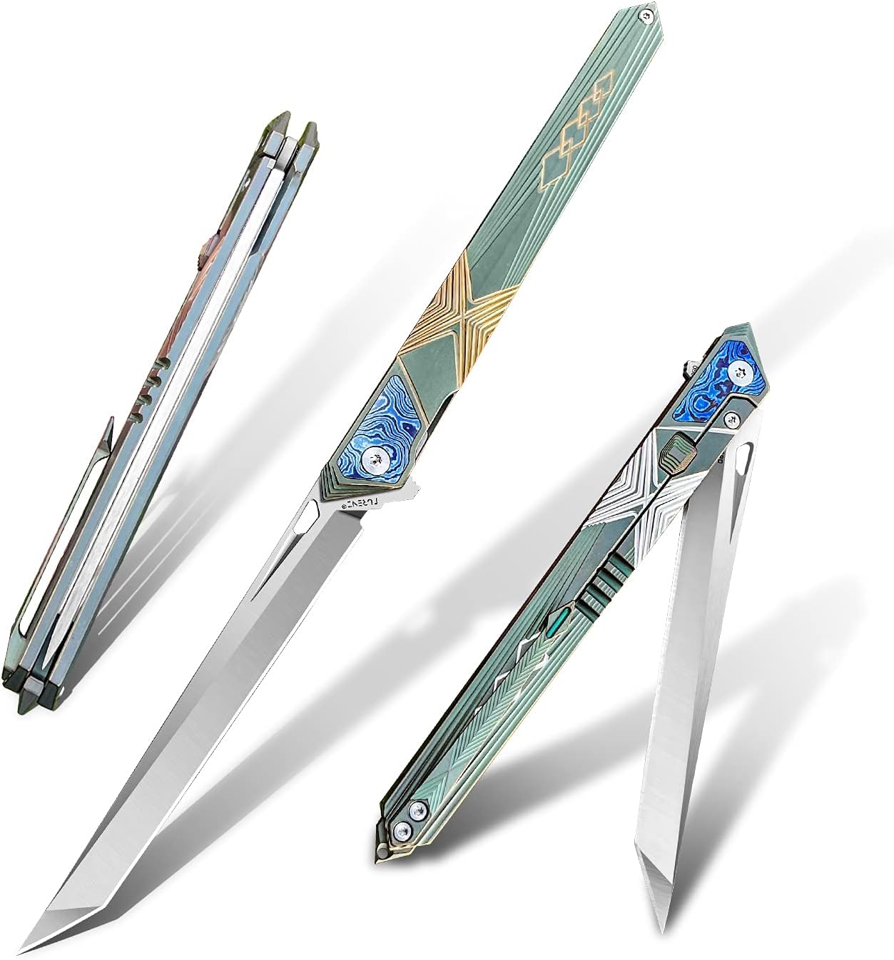 Hoja de acero M390 de punta tanto de estilo japonés de aproximadamente 4 pulgadas, afilada y duradera. Esta es una exquisita navaja de bolsillo samurái de estilo japonés.