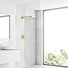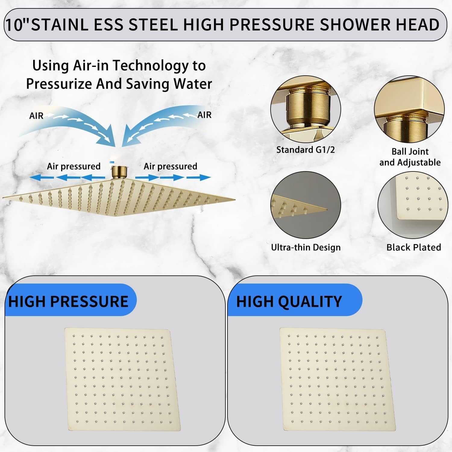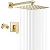 Grifo de ducha de oro cepillado GGStudy Kit de remate de ducha de función única con válvula de entrada gruesa Sistema de grifo de ducha de lluvia 10 pulgadas Cabezal de ducha de metal cuadrado de acero inoxidable