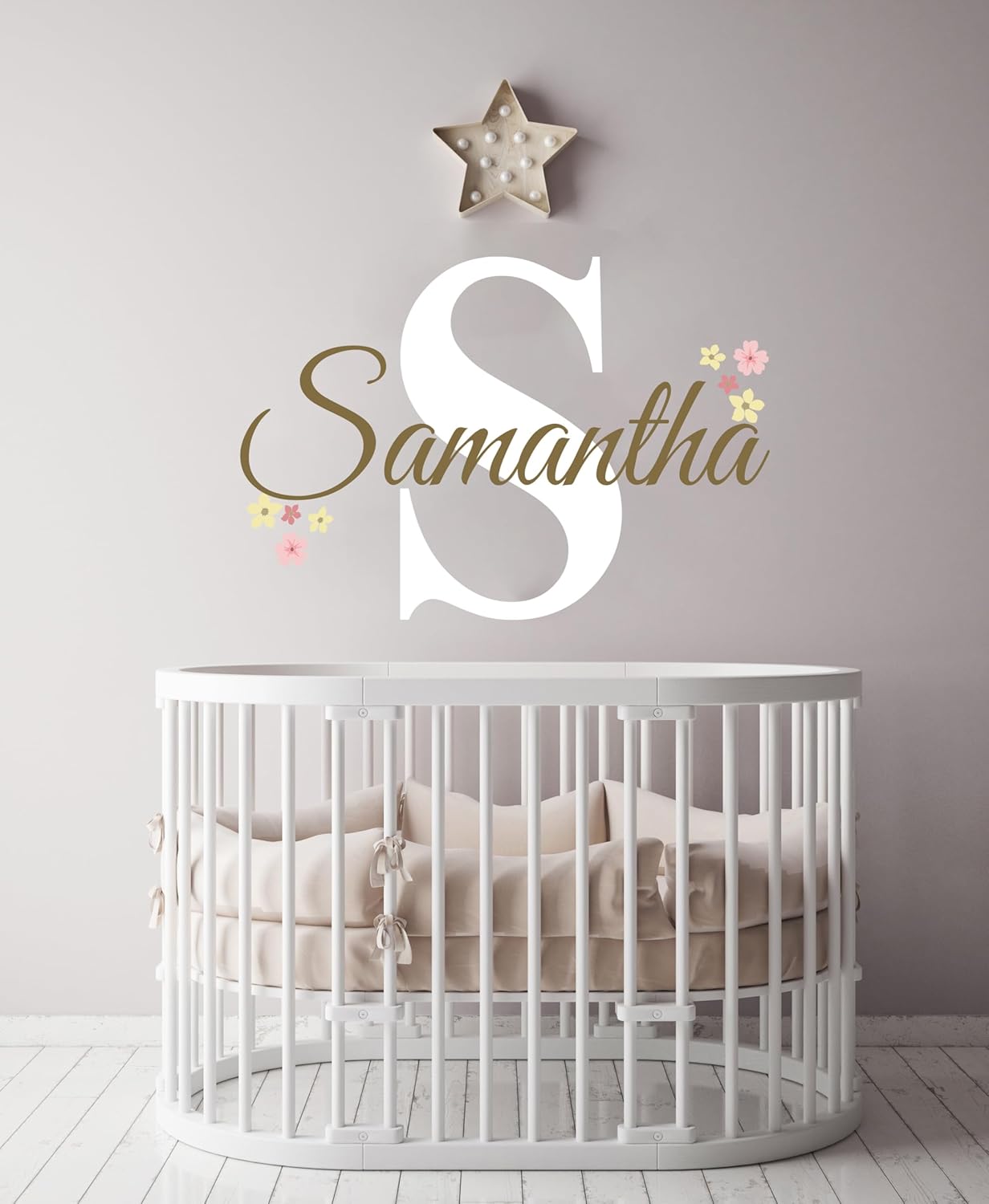 Custom Name and Initial with Flowers Wall Decal - Personalized & Art Mural Girls Decor Stickers for Nursery Bedroom Decoration (Mini Wide 16 inchx10 inch Height)