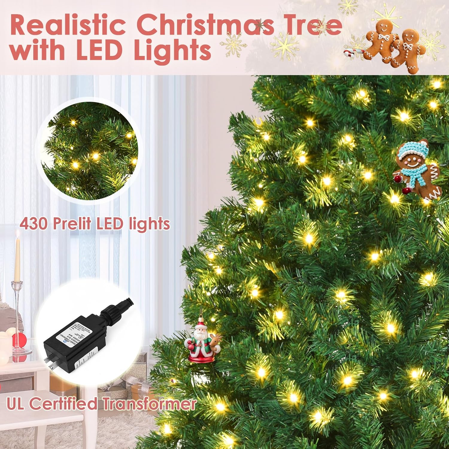 8ft Prelit Christmas Tree, Indoor Xmas Tree w/Pre-Strung 430 Warm White LED Lights, 1438 PVC Branch, Metal Hinge& Foldable Base, Artificial Christmas Tree for Home, Holiday, Party Decoration