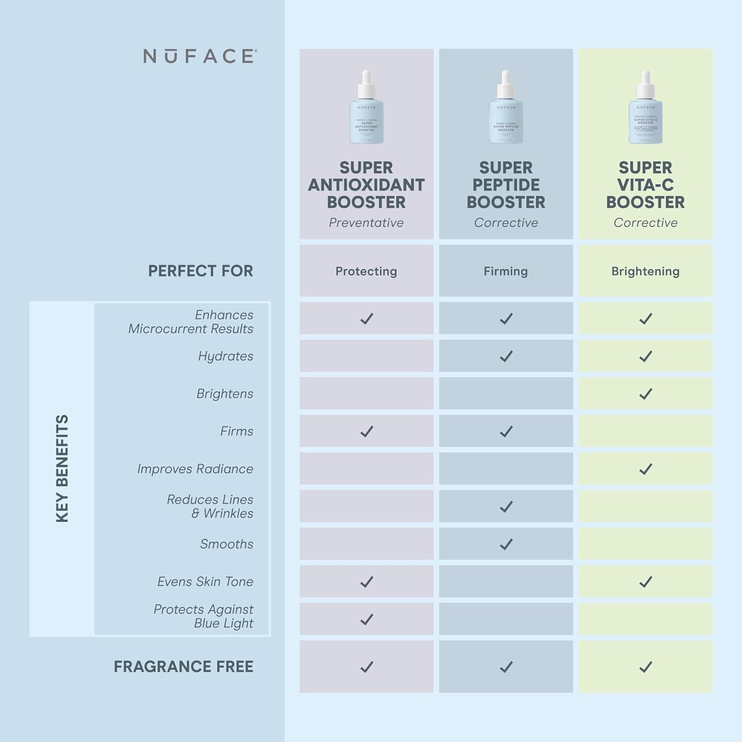 Designed for Your Skin's Unique Goals - Whether it's to brighten, firm, or protect, apply any of the NuFACE Super Booster skin care serums individually as a targeted treatment or combined for a simple yet customized regimen.