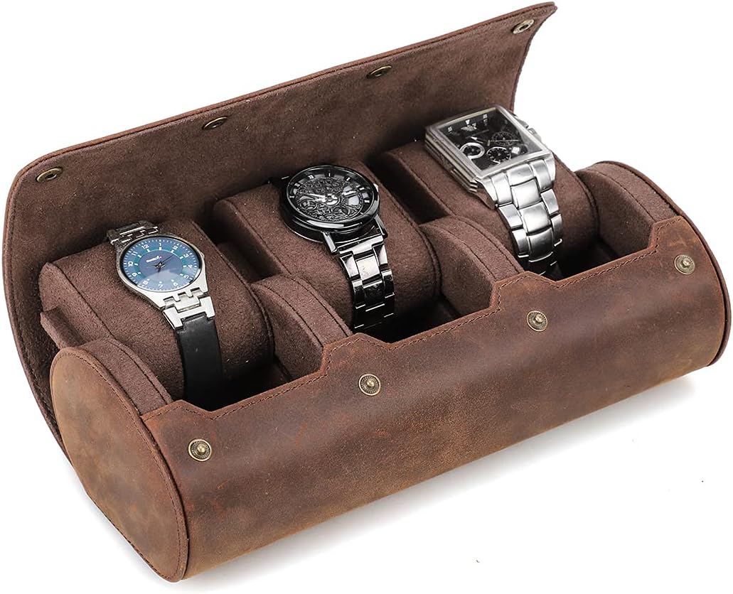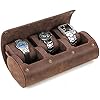Hiram Leather Watch Roll Travel Case,Vintage Crazy Horse Leather 3-Slots Watch Box with Removable Velvet Pillows, Secure Metal Clasp, Perfect for Daily Display & Business Travel