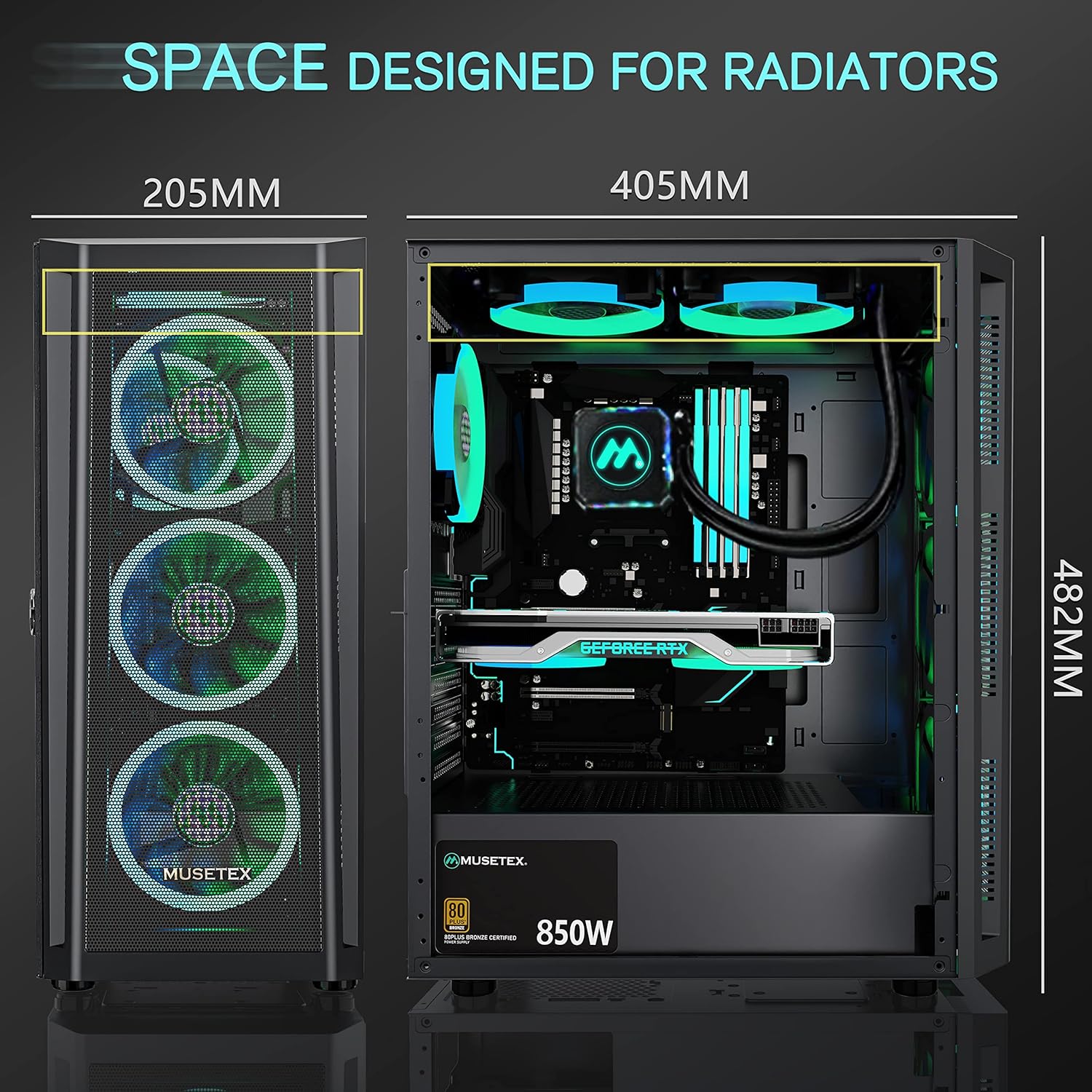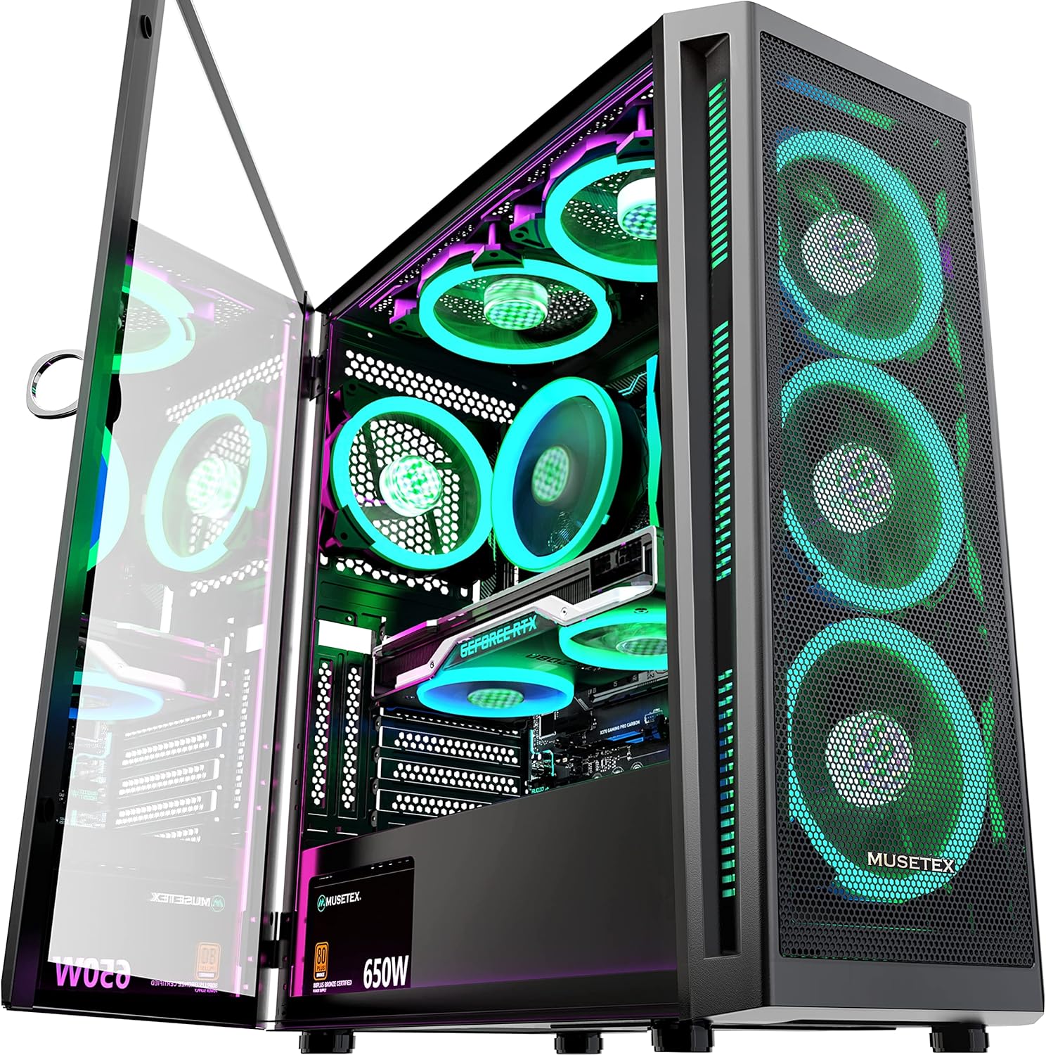 Caja de PC ATX MUSETEX con 6 Ventiladores ARGB PWM Preinstalados, Caja de Juego de Media Torre con Panel Lateral de Vidrio Templado, Caja de Computadora de Malla, TW8