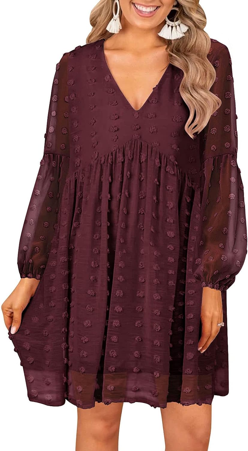 Description:"Material:100%Polyester Color: Army Green/Black/Caramel/Light Blue/Burgundy/Navy Blue Style: Casual and street style, fashion style, summer casual style. Sleeve:long sleeve Pattern:Solid color Decoration: These womens babydoll dresses are designed with cute swiss dot, sexy v neck, short sleeve, elestic waistband, 2 pokects, high waist, loose fit, fully lined, knee length and solid colors.These womens babydoll dresses are designed with cute swiss dot, sexy v neck, long sleeve, high waist, loose fit, fully lined, knee length and solid colors. Season: Women’s summer casual dresses are suitable for Summer hot days, Spring and other seasons.Gender: Women Fit Style: Loose fit Suitable for spring and summer days. These womens summer dress is great for beach, outdoor, party, honeymoon, cocktail, wedding, club, dating, evening or other casual daily wear. This swiss dot chiffon summer mini dress is chiffon, lightweight, breathable and comfortable to wear. soft layer lining add on the body to avoid see-through, casual flowy fitting, best choice for work/business.Cute babydoll dress is easy to match with nude heels to create a casual look. Pair With a sandal, walking on the beach, and enjoying the sun, make you more attractive on any occasion.It Is easy to pair this cute summer dress with high heels or flat sandals for a casual look. Cute swiss dot dress with flowy ruffle hemline, a must-have summer dress in your wardrobe. Package Content: 1 x Women mini dress Size: Size refer:There are 5 sizes (S/M/L/XL/XXL) available for the following listing. please allow 1-2cm differs due to manual measurement, thanks (All measurement in cm and please note 1cm=0.3937inch)"