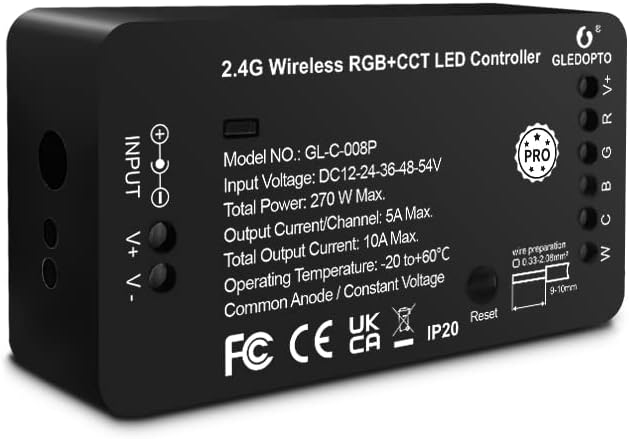 Product Name:ZIGBEE RGB+CCT Strip Controller Model No.:GL-C-008P Voltage: DC12V-24V Output: Max. 6A/Channel, Total output Max.15A Product Size: 89*48*23.5mm Package Including: 1 x GLEDOPTO Zigbee Pro RGBCCT LED Strip Light Controller 1 x User Manual Connect with Gateway: 1. Connect the LED product to the power socket; 2. Start the device searching on the ZigBee Light Link Gateway, it could take some time.(If the Gateway does not find the device, plug power off/on or make a reset. 3. The Gateway found your device and you can assign it to the different rooms/zones/groups. 4. Now you can use the device. Note: If the gateway cannot find the device and reset can't work, please try to restart the router and gateway.