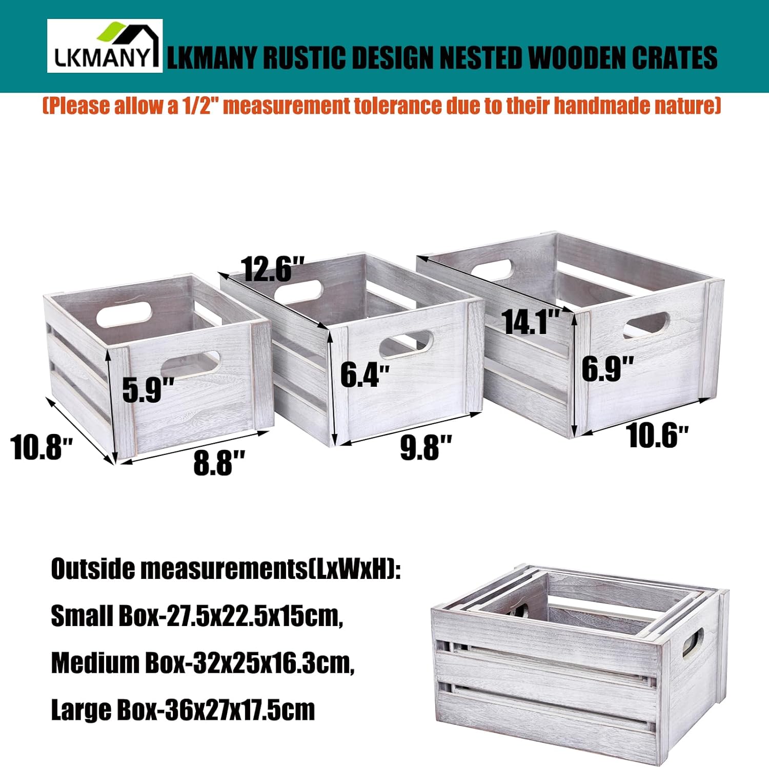 DIMENSION – Outside measurements(LxWxH): Small Box-10.8"x8.8"x5.9", Medium Box-12.6"x9.8"x6.4",Large Box-14.1"x10.6"x 6.9"(Please allow a 1/2" measurement tolerance due to their handmade nature)
