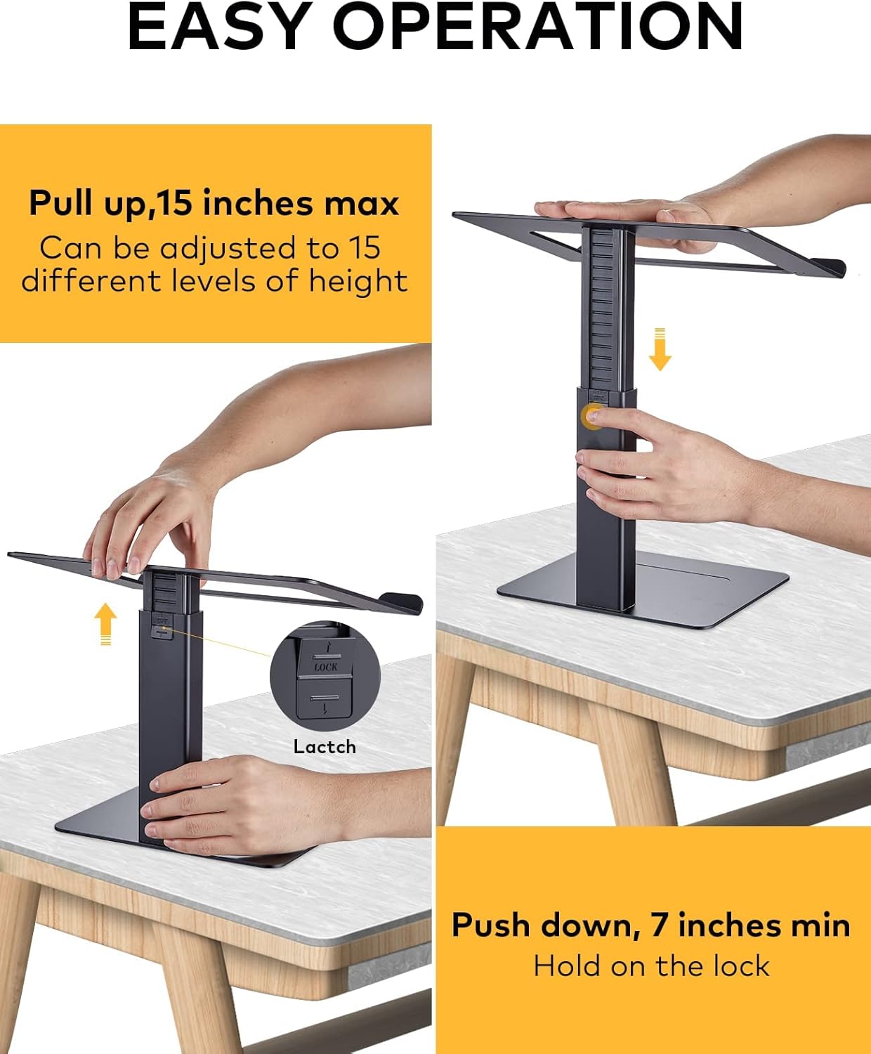 【Adjustable Height】: You can simply pull the pole to elevate the laptop riser from 7-15 inches for your preference (PLZ DONT PRESS THE LOCK BUTTON WHEN YOU PULL IT UPWARD). However, you need to KEEP PRESSING THE LOCK BUTTON on the pole and push the pole downward if you want to make it lower. The max height is for people who want to shift to a standing mode to prevent sitting for too long.