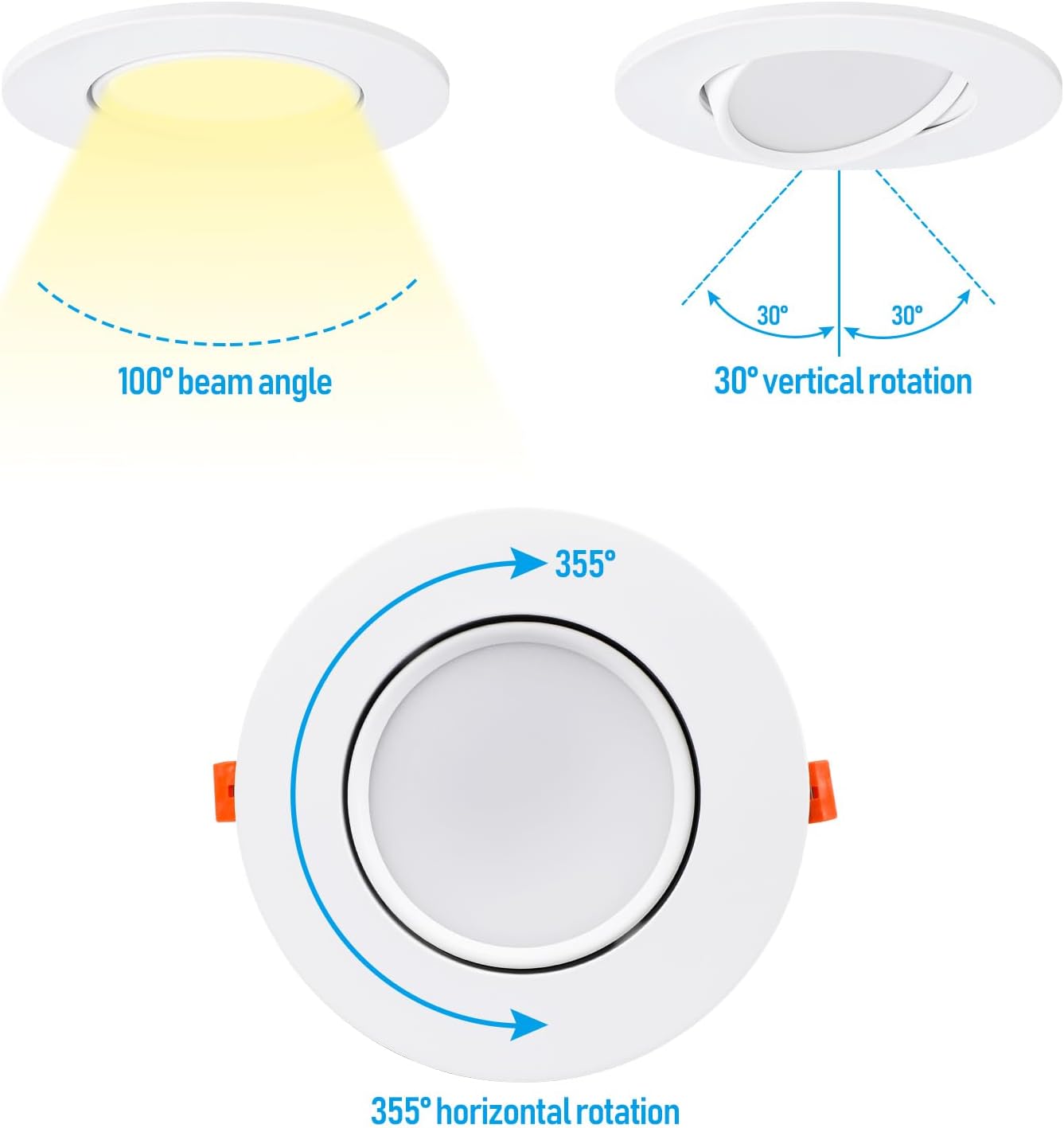 Rotatable Wide-Angle Design: With 355° horizontal rotation, 30° vertical rotation and a 100° beam angle, this adjustable angled downlight is perfect for illuminating areas like living rooms, studies, kitchens, and bedrooms