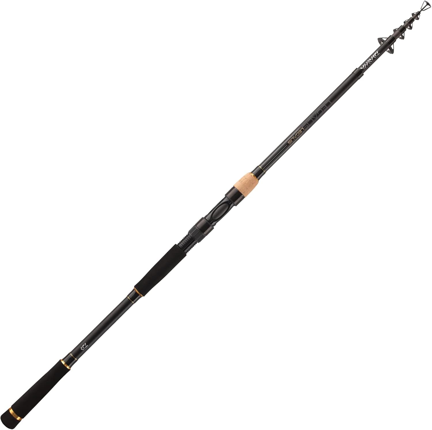Daiwa Legalis Tele Allround, Telescopic Fishing Rod The Legalis Tele series includes a large selection of short section telescopic fishing rods. With compact transport dimensions of only 29.5 to 34 inches, these fishing rods can easily be stowed in the fishing bag or transported by bicycle or in the car to save space. The extensive lineup of this series includes fishing rods that are suitable for both spin fishing for trout, perch and pike, as well as for bottom and float fishing for almost all of our native coarse fish species. The semi parabolic HMC carbon fiber blank of the Legalis Tele fishing rods invites you to cast very good at and transports assemblies and artificial baits to enormous casting distances. An even bending curve prevents the hook from slitting. Equipped with titanium oxide tele guides, CNC milled aluminum reel seat and an ergonomically designed cork / EVA handle.