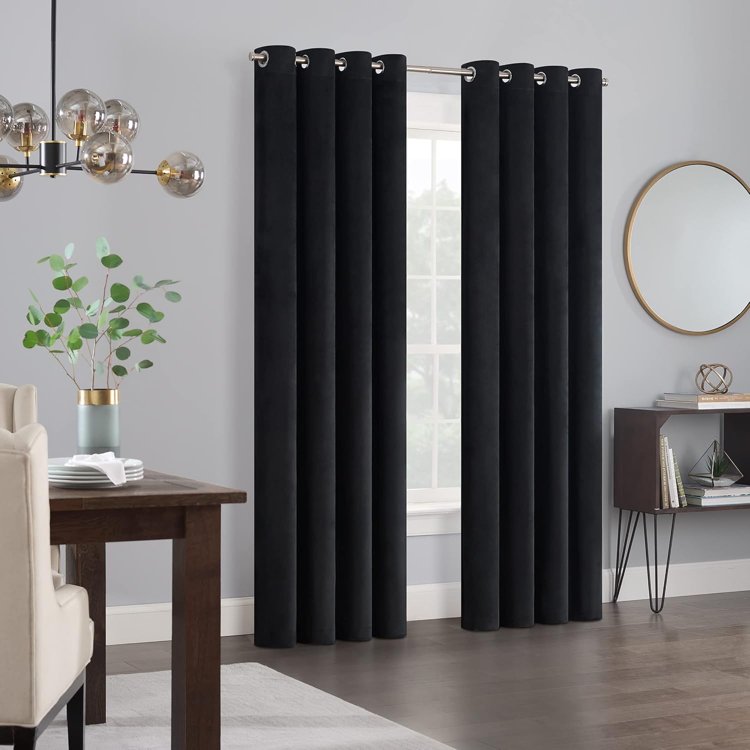 Eclipse Aurelia Velvet Room Darkening Grommet Noise Reduction Window Curtains (2 Panels), 52 in x 54 in, Black
