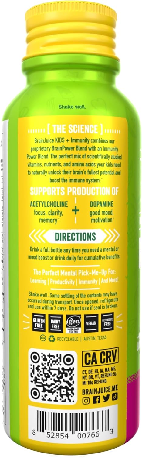 PERFECT PICK-ME-UP: BrainJuice Kids + Immunity is a natural wellness focus drink that supports immunity and daily brain health for kids ages 5+. Give it to your child anytime they need a pick-me-up, or give daily for cumulative benefits. Each box includes 12 x 2.5 oz shots.