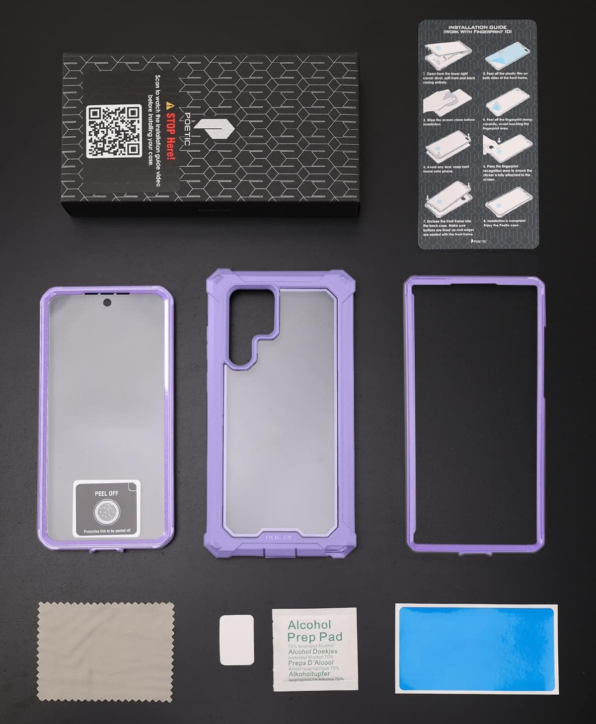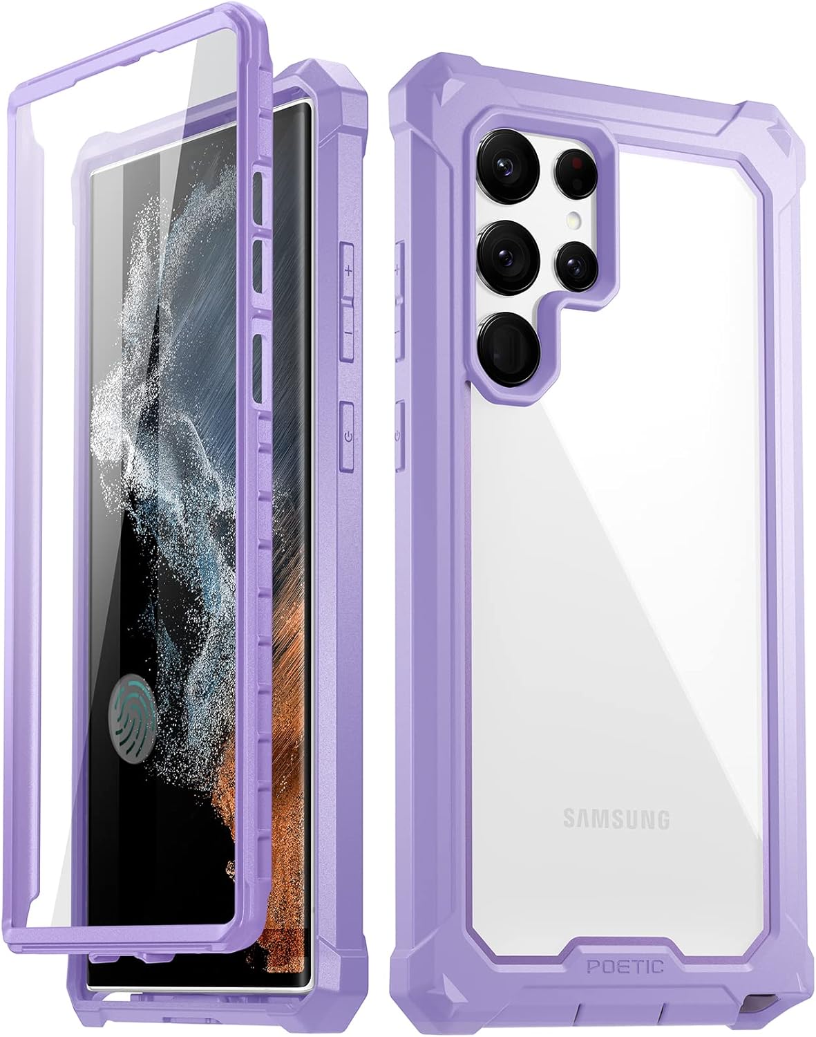 Funda Compatible con Poetic Guardian para Galaxy S22 Ultra 5G de 6.8 pulgadas, Protector de Pantalla Integrado Compatible con ID de Huella Dactilar, Funda Resistente Hybrid Shockproof Completa, Púrpura/Transparente