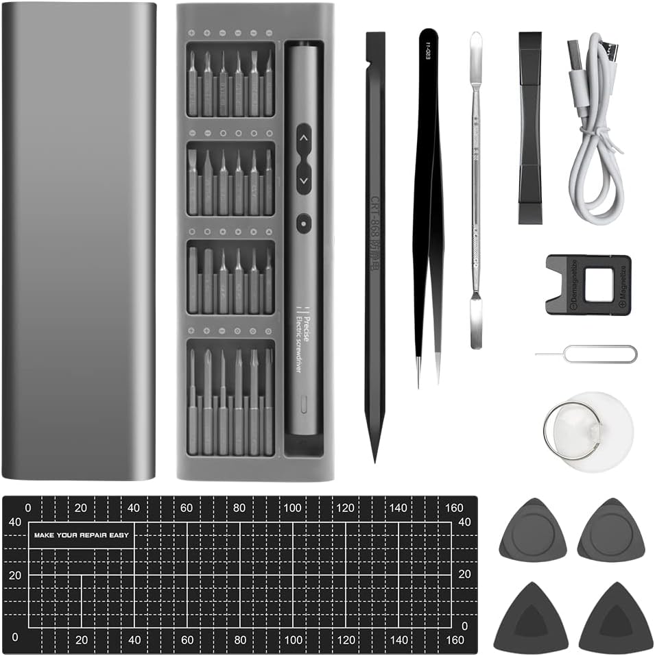 【𝐖idely 𝐀pplicable】This Power screwdriver includes with 48 precision bits, Magnetic Worktable Pad, Sucker, Crowbar, Tweezers, etc. Suitable for the quartz watch, cameras digitals, radios, tablet PC, cellphones, drones, joystick, laptop, iPhone, Eyeglass, Macbook, Xbox and toys, furniture, etc.