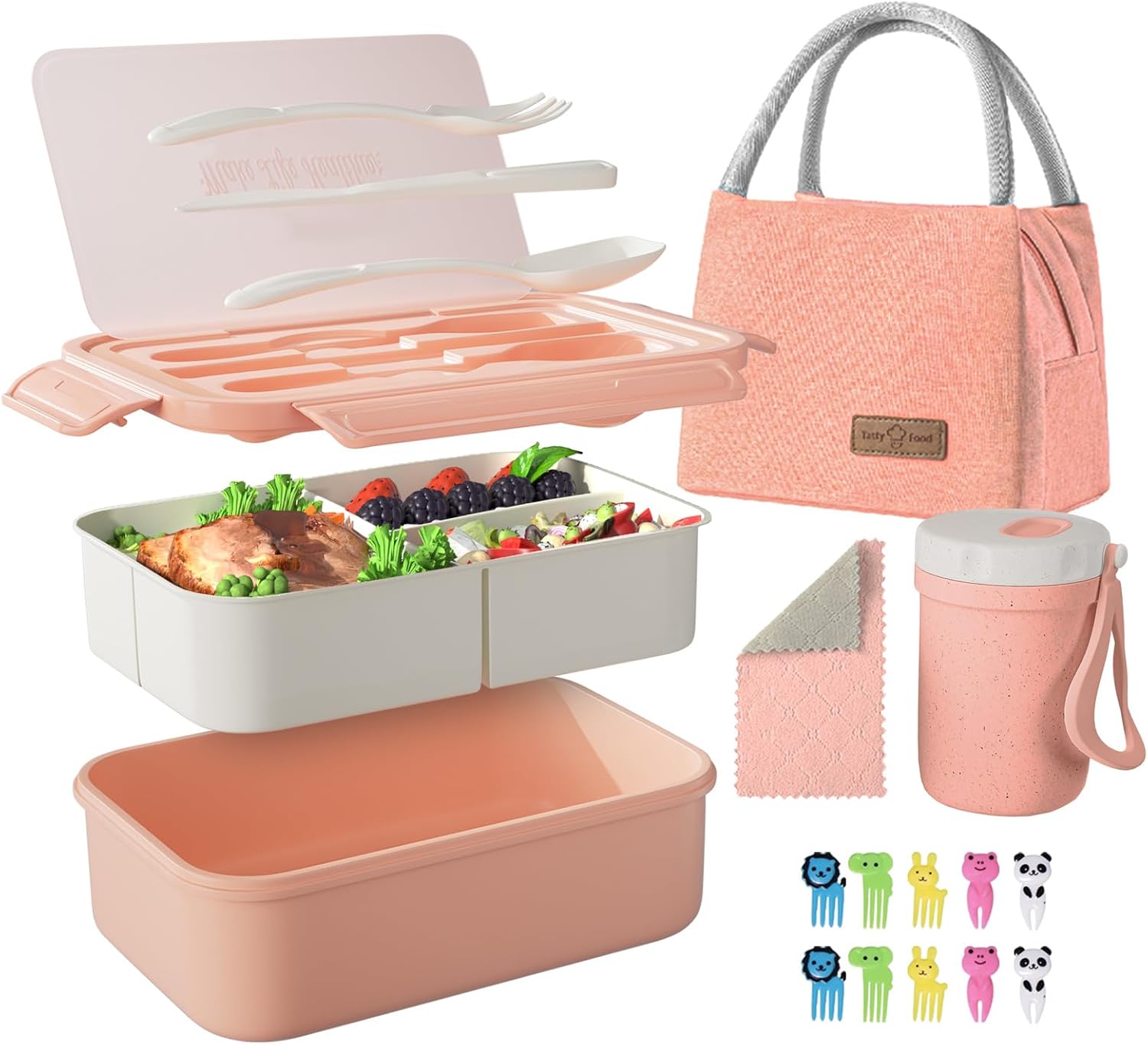 caja bento para niños, caja bento a prueba de fugas de 1100 ml, lonchera para niños Mom's Choice, tenedor de fruta lindo, paño de limpieza, taza nutritiva, juego de bolsas de almuerzo (17 piezas) sin BPA, apto para lavavajillas y microondas (juego rosa)