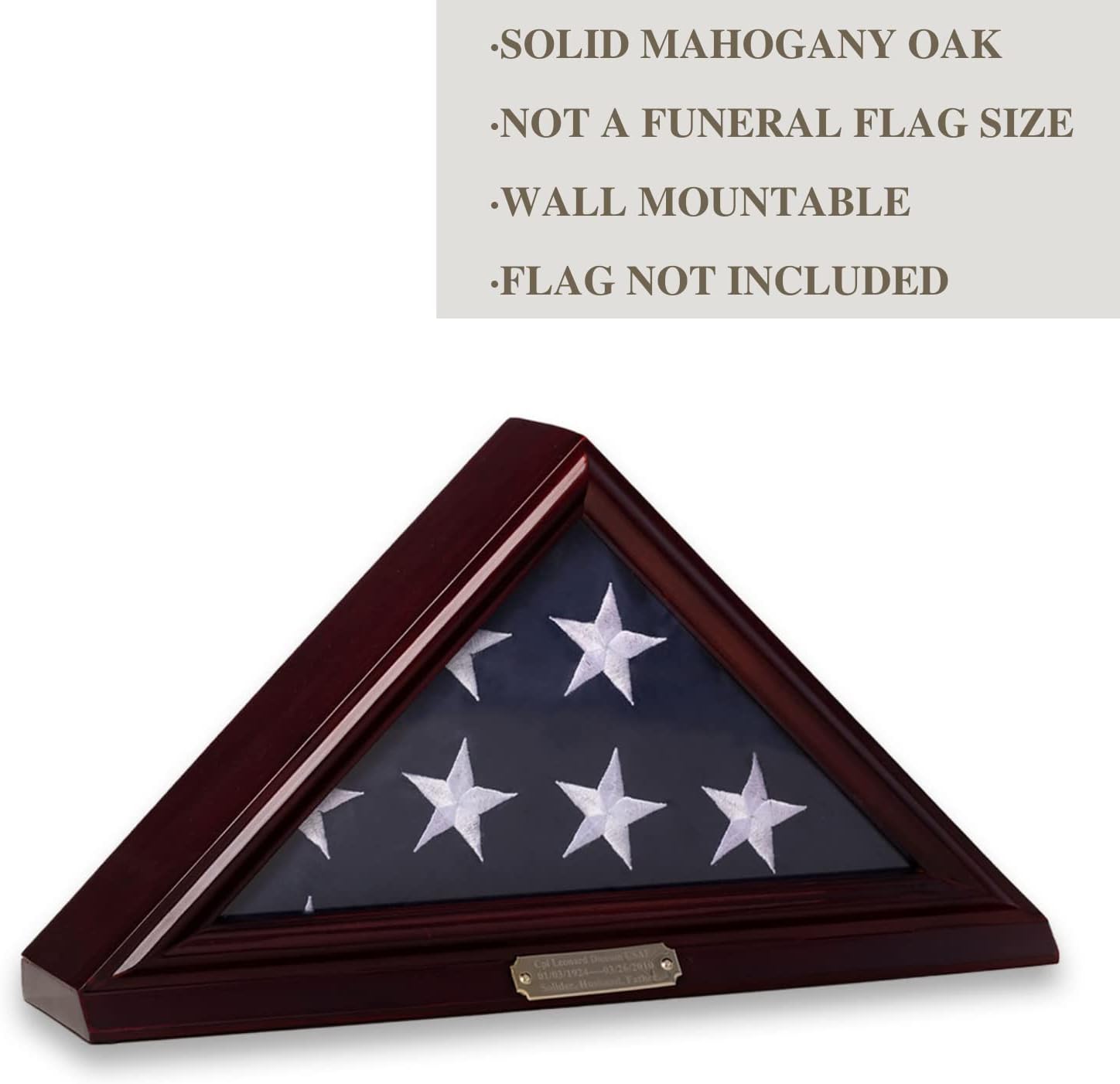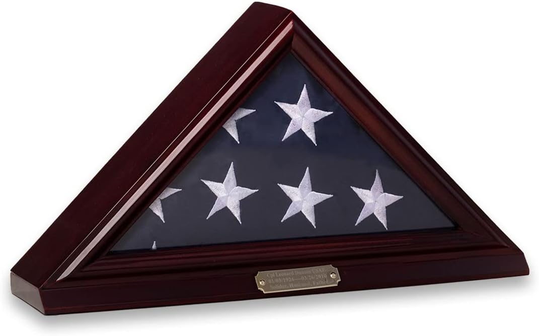 Preserve and display a cherished flag in this gorgeous triangle solid wood flag case. Place our memorial flag display on a table or wall mount it with two strong wall mountable hardware (included). It features a metal plaque for engraving, a clear glass front to protect from dust, removable back for easy insertion, detailed beveled edge, matted interior to make it flag material friendly and two strong hangers for hanging on the wall. It will be an honor to display any flag in this fine quality flag case. No assembly is required. It holds a 3'x5' flag. Flag is not included.