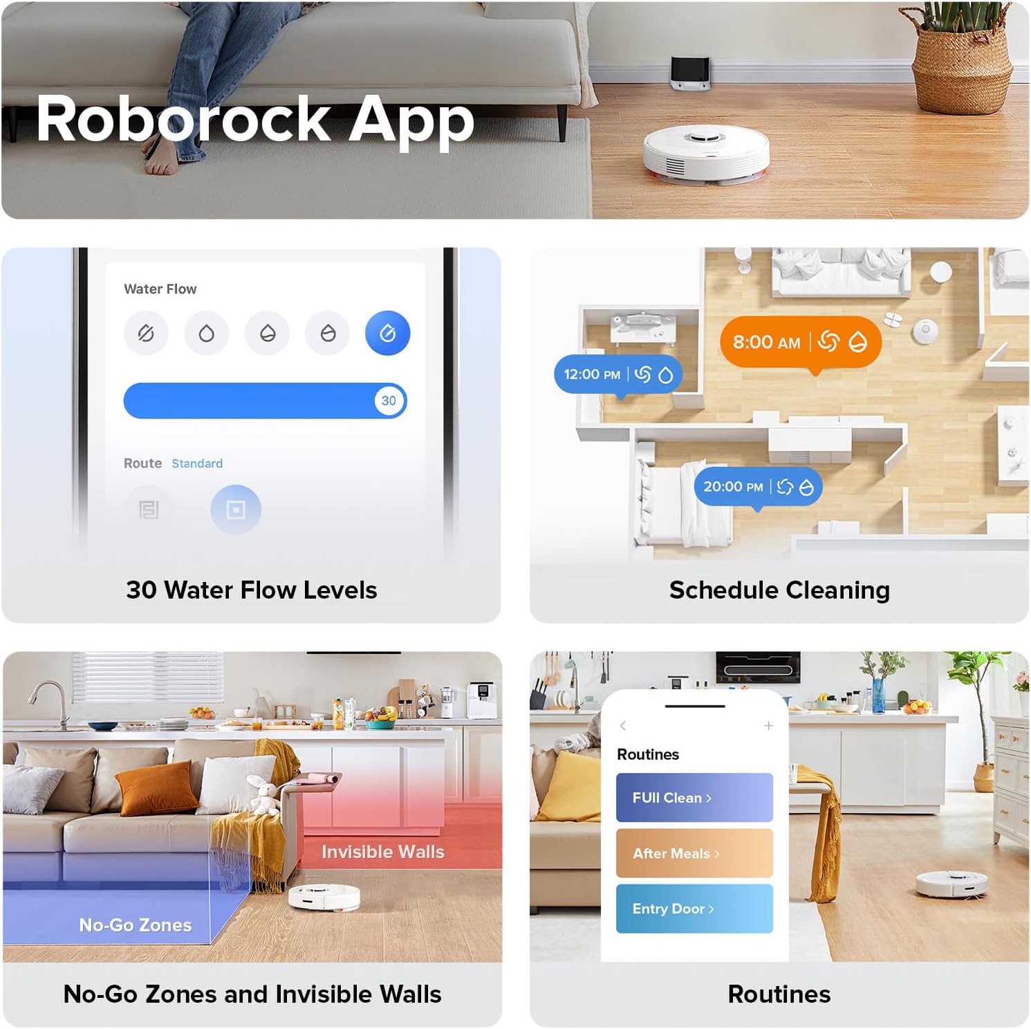 Aspira y Trapea Simultáneamente: Para eliminar el polvo fino que la aspiración sola podría pasar por alto, este aspirador robot puede aspirar y trapear en una sola pasada; su bomba electrónica ofrece 30 niveles de flujo de agua ajustables, permitiéndote personalizar la limpieza según el tipo de piso y preferencia