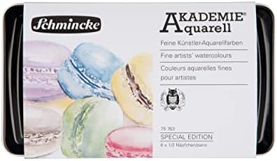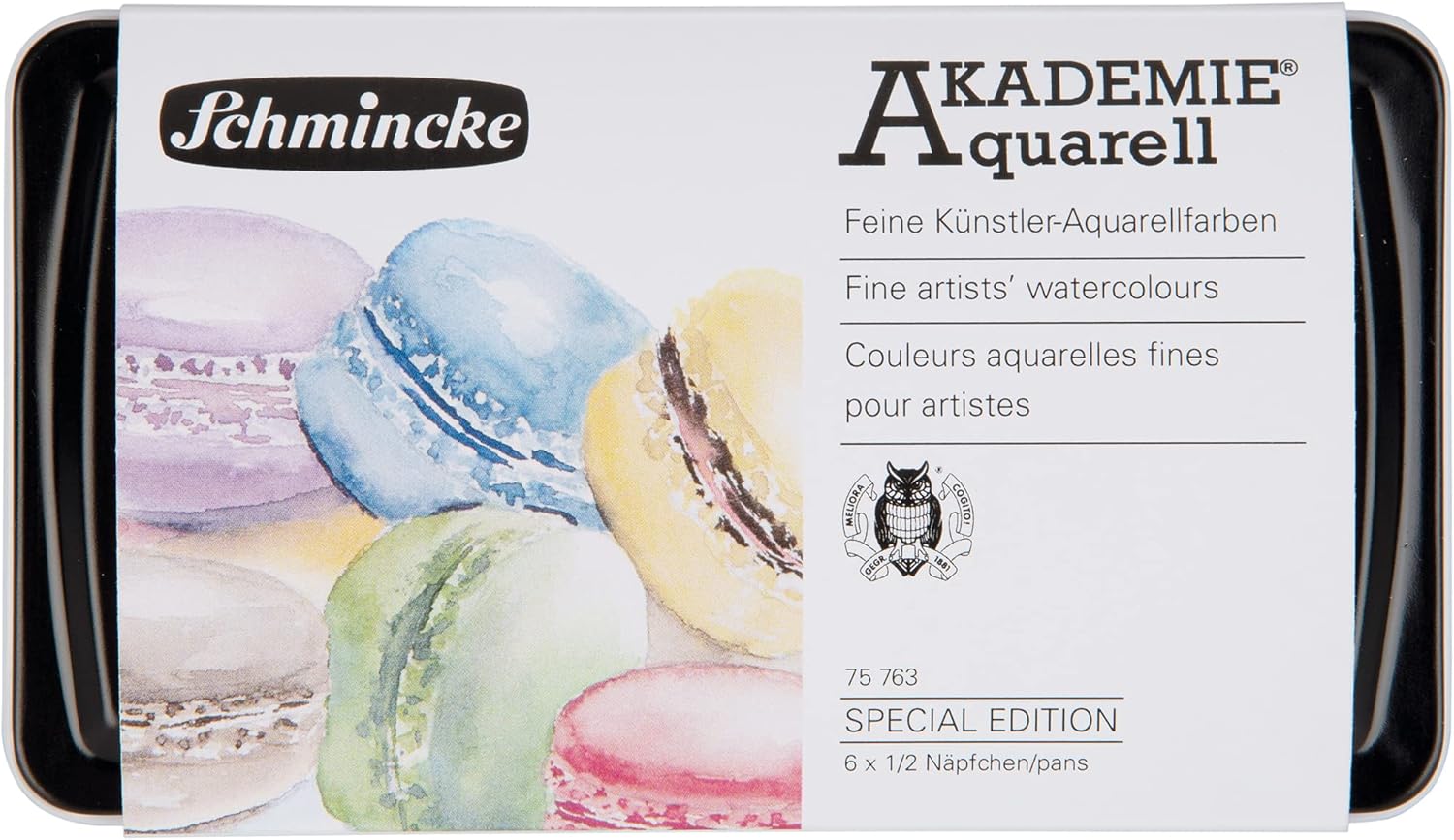 Schmincke - AKADEMIE® Aquarell Macarons, 6 x 1/2 Pans, 75 763 097, Compact Paint Box with Pastel-Like Special Colors, Metal Box, Highly lightfast, fine Artists' Watercolors