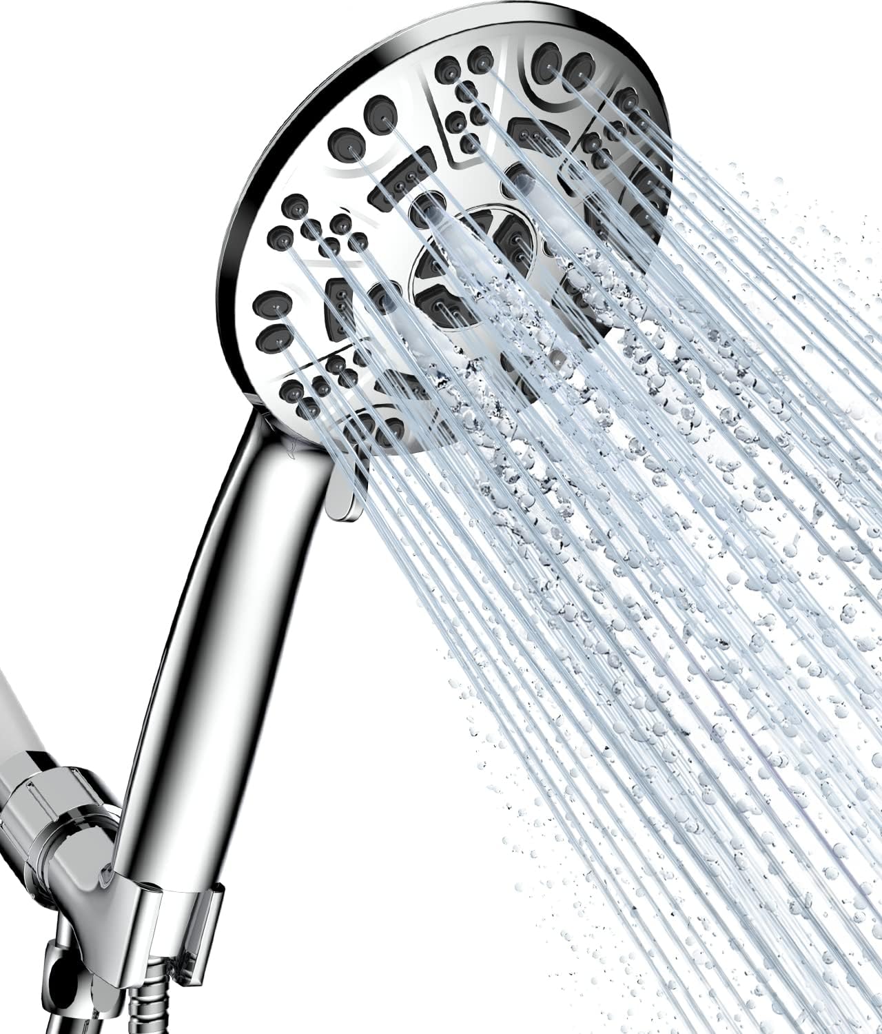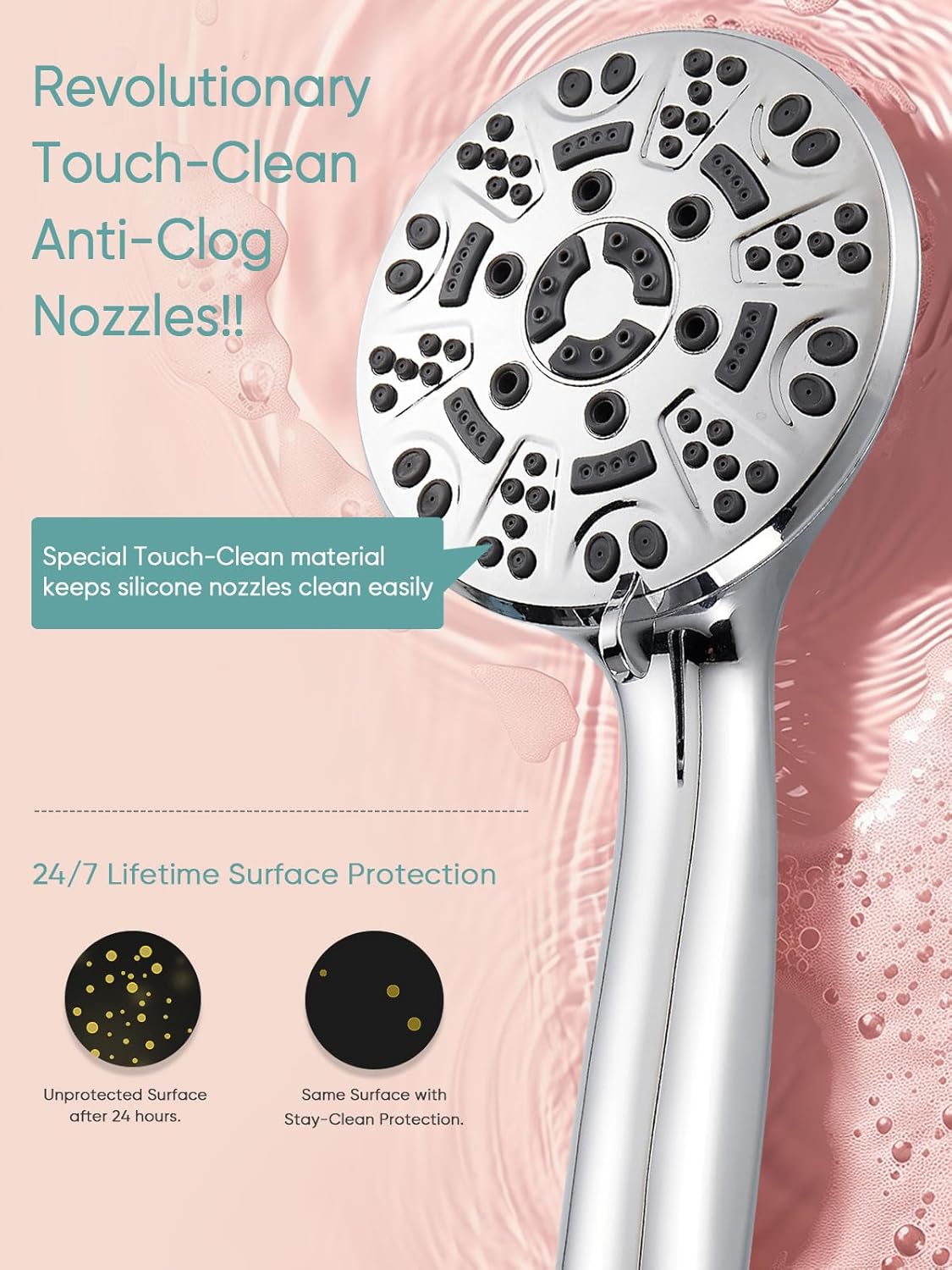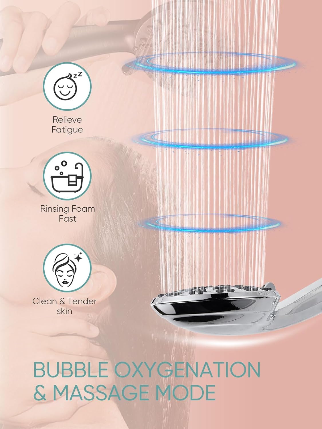 [Water Saving with Great Pressure] The shower head is more water saving than regular shower. It has amique internal space structure and pressure boosting technology that quickly recognizes soap scum and dried hair left behind after each shower in seconds. The powerful water pressure is gentle enough on your tired body all in minutes.