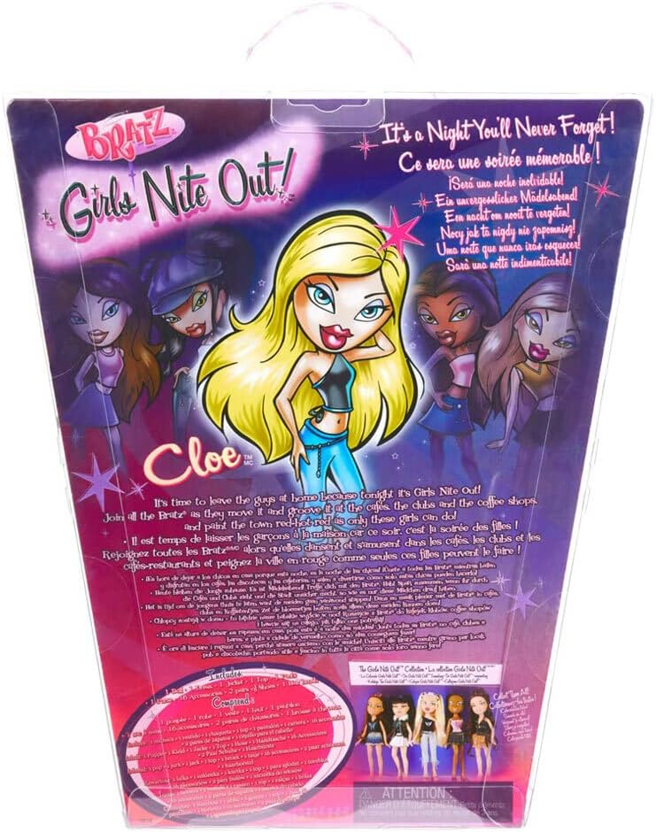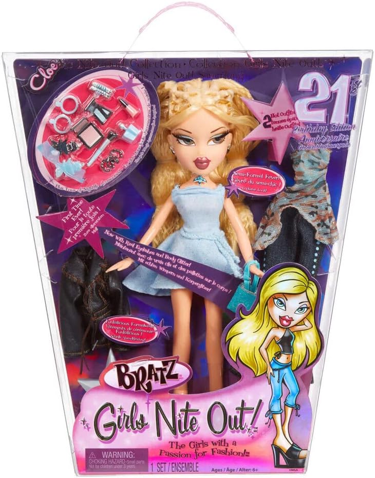 #TBT cuando las Bratz® dejaron a los chicos en casa! En celebración de que Bratz® cumpla 21 añoz, ¡puedes coleccionar réplicas de las muñecas Bratz® Girls Nite Out™. Únete a todas las Bratz® mientras se mueven y bailan en los cafés, clubes y cafeterías, y pintan la ciudad de rojo ardiente como solo estas chicas pueden hacerlo! Los coleccionistas y nuevos fans de Bratz® pueden celebrar 21 añoz de las Chicas con Pasión por la Moda™ con esta querida línea. Desde los estilosos trajes hasta los accesorios glamurosos, son réplicas casi exactas de los originales icónicos. ¡Ahora en empaquetado de edición especial con un motivo de edición 21º cumpleaños! Cada muñeca incluye 2 trajes— uno para una fiesta semiformal y uno para relajarse en la fiesta posterior. También incluye un bolso, gafas de sol, pulseras, 2 pares de aretes, collar, brillo de labios, botella de perfume, rubor, espejo compacto, pincel de maquillaje, 2 juegos de clips para el cabello, 2 pares de zapatos y un cepillo. ¡Sal con Cloe™ y el resto de las Bratz® Girls Nite Out™! ¡Colecciona todas las 5 muñecas Bratz® Girls Nite Out™— Cloe, Yasmin, Jade, Sasha y Dana. ¡Disponibles ahora!