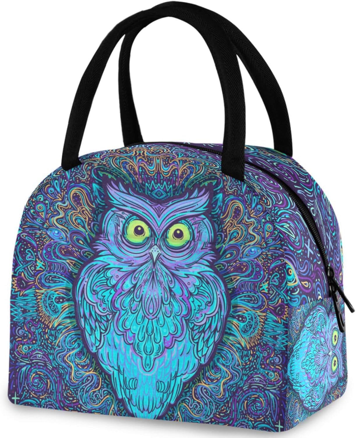 Ethnic Totem Owl Ornate Pattern Lunch Tote Bag with Front Pocket Reusable Insulated Thermal Zipper Closure Cooler Container Bag for School Work Picnic Travel Fishing Beach