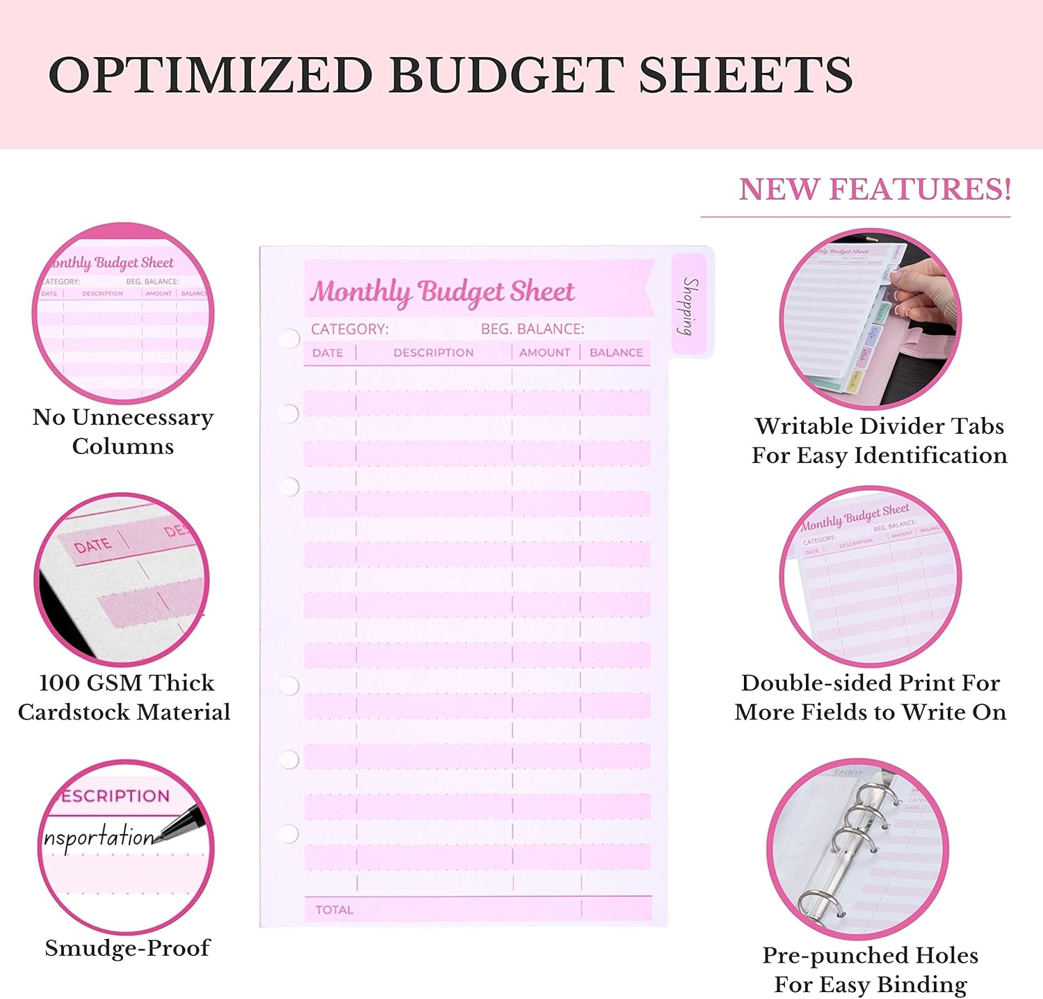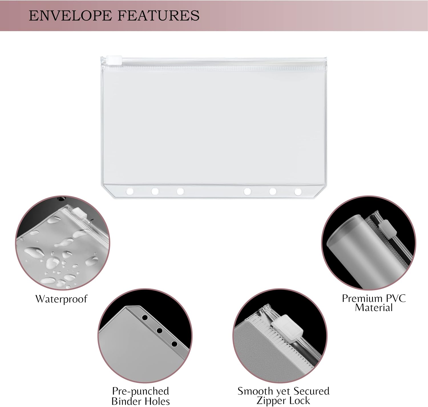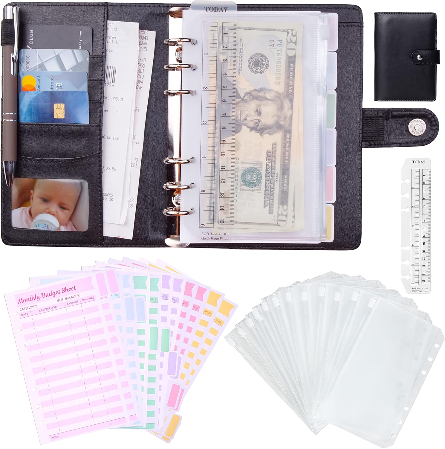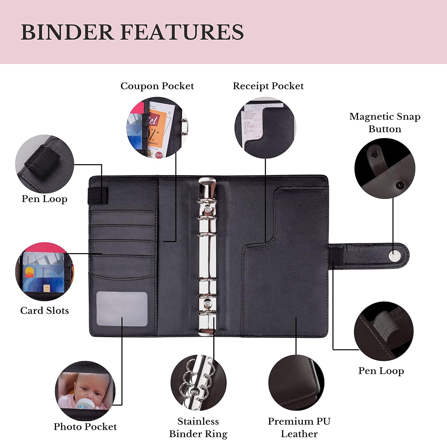Sistema de presupuesto completo - Esta carpeta de cuero A6 le hará presupuestar con estilo elegante a través de su aspecto limpio y ordenado además de sus colores lindos. El set incluye 12 sobres transparentes de PVC para presupuesto en efectivo. 12 hojas de presupuesto mensual para el registro de gastos que se ajustan al anillo de 6 anillos incorporado para encuadernación. También viene con etiquetas adhesivas y localizador de páginas para identificar fácilmente sus sobres de presupuesto. De hecho, un set completo de organizador de dinero