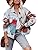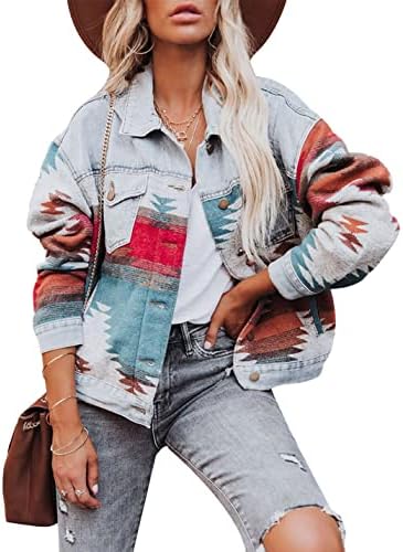 HangNiFang Aztec Denim Jacket Shacket for Women Button Down Vintage Distressed Blue Jean Jacket