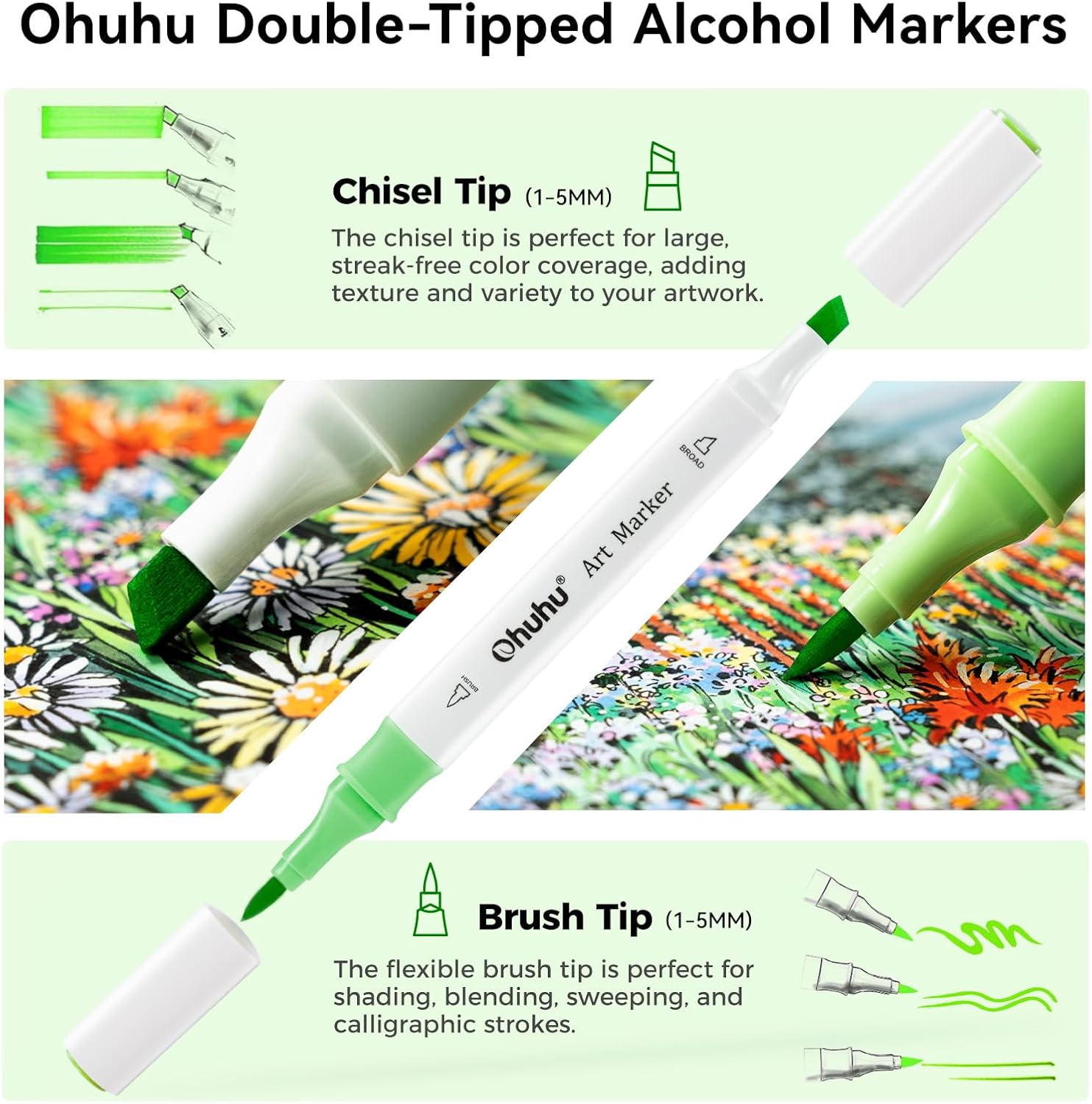 ¡Llamando a todos los creativos! El conjunto de marcadores de pincel Ohuhu a base de alcohol de doble punta es perfecto para colorear adultos, artistas, ilustradores, animadores, diseñadores de interiores, arquitectos, niños, estudiantes o cualquier persona que quiera explorar su cerebro derecho. Estos marcadores de dibujo vienen en una amplia variedad de colores llamativos y vívidos que abarcan todo el espectro de colores. ¡Usa las tapas codificadas por color para hacer tu selección! Una punta de pincel permite un coloreo y mezcla fácil, y la punta de cincel es ideal para colorear rápidamente grandes áreas. La tinta es no tóxica, libre de ácido, sin olor y se seca instantáneamente. Hemos incluido una caja organizadora de marcadores de bonificación para mantener tus marcadores a mano. Lleva tus creaciones al siguiente nivel con el conjunto de marcadores de arte de doble punta de Ohuhu Alcohol Brush Markers!