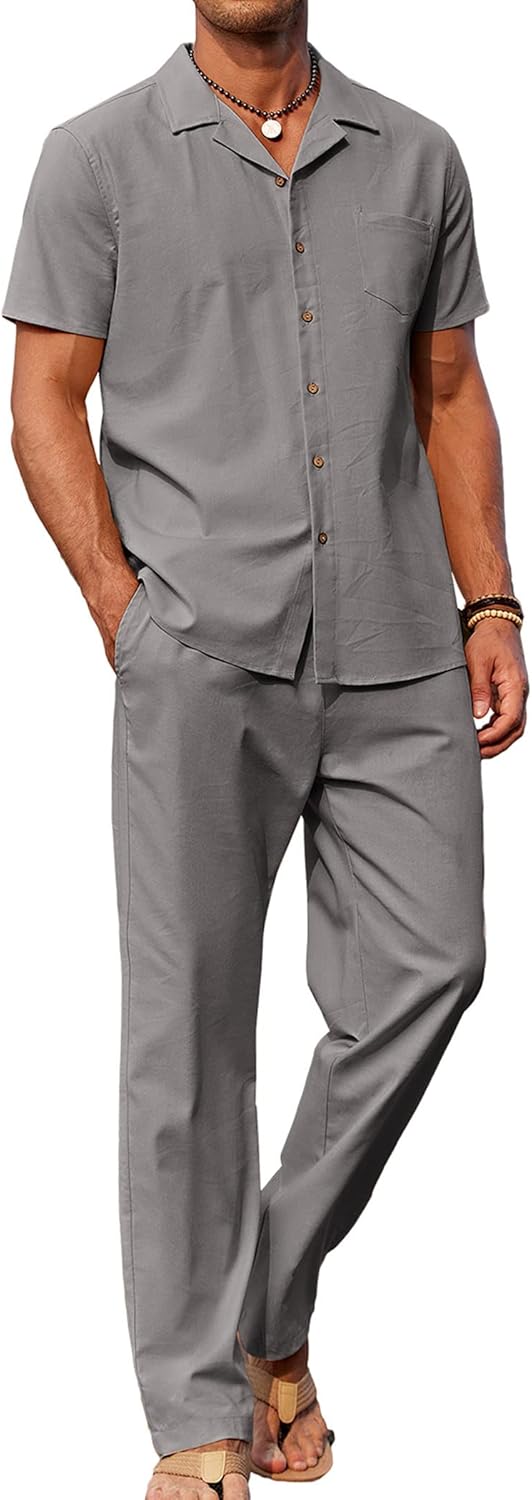 COOFANDY Men 2 Piece Linen Outfit Beach Button Down Shirt Casual Loose Pant Sets
