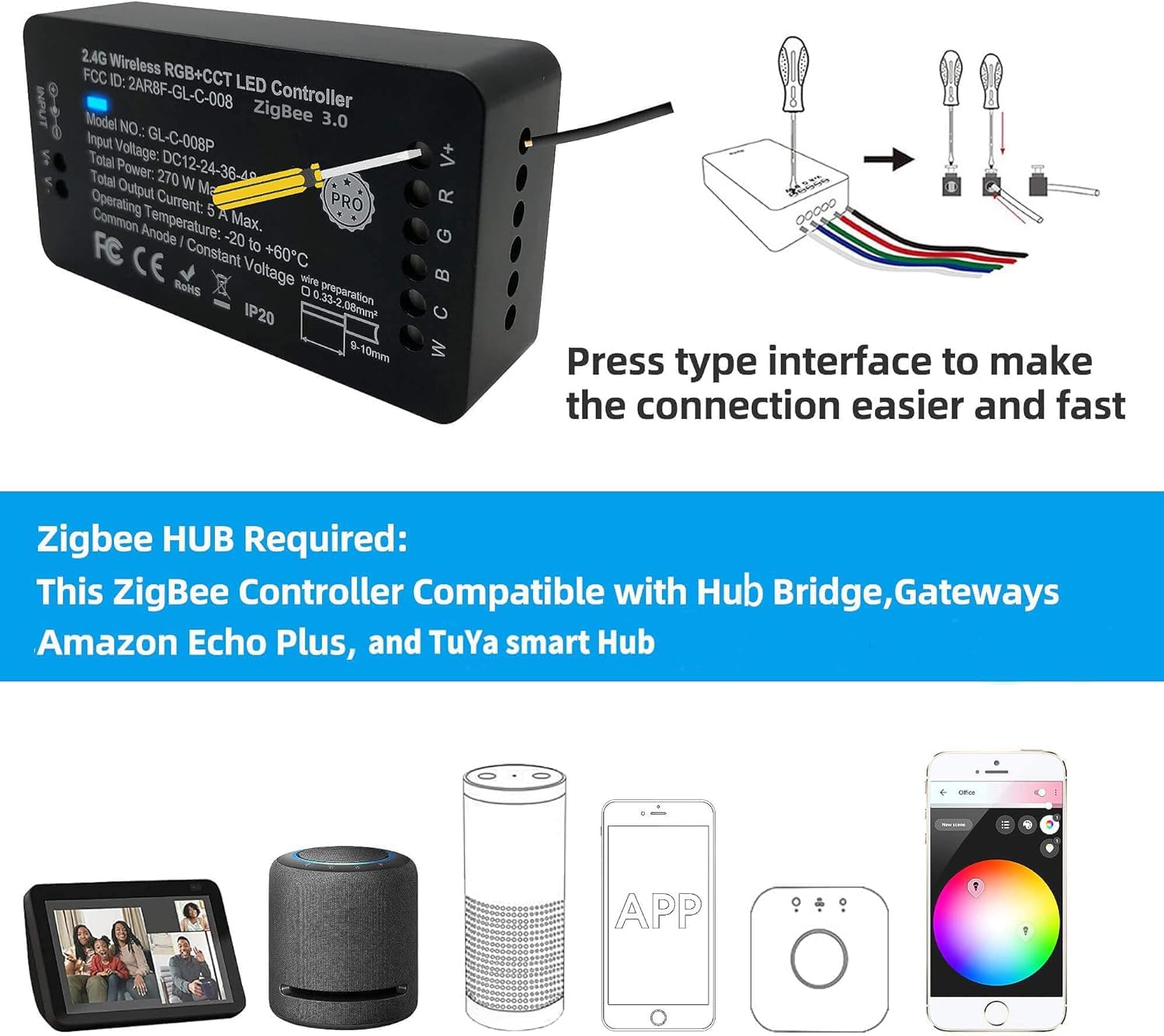 Work with Standard ZigBee 3.0 Gateway: Compatible with HUB bridge Tuya smart hub etc.Hub APP Smart Control your ZigBee LED strip. zigbee led controller rgbw does not work without ZigBee Hub